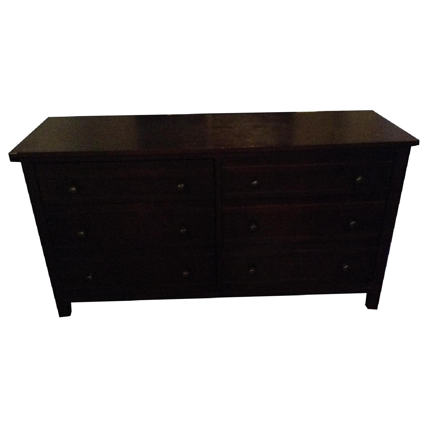 Seller's Notes:Moving and very disappointed that this dresser does not fit. A few scratches but otherwise good condition. Coffee finish with protective lacquer. Metal roller glides. Solid poplar, birch and hardwood veneer, and engineered wood. 58.5"Wx19.5"Dx31"H Mid & Bot Drawer FrontsWidth: 25.75" Height: 8.25" Top Drawer FrontWidth: 25.75" Height: 6.5" Depth W/Drawers OpenDepth: 32" Overall DimensionsWidth: 58.5" Depth: 19.5" Height: 31