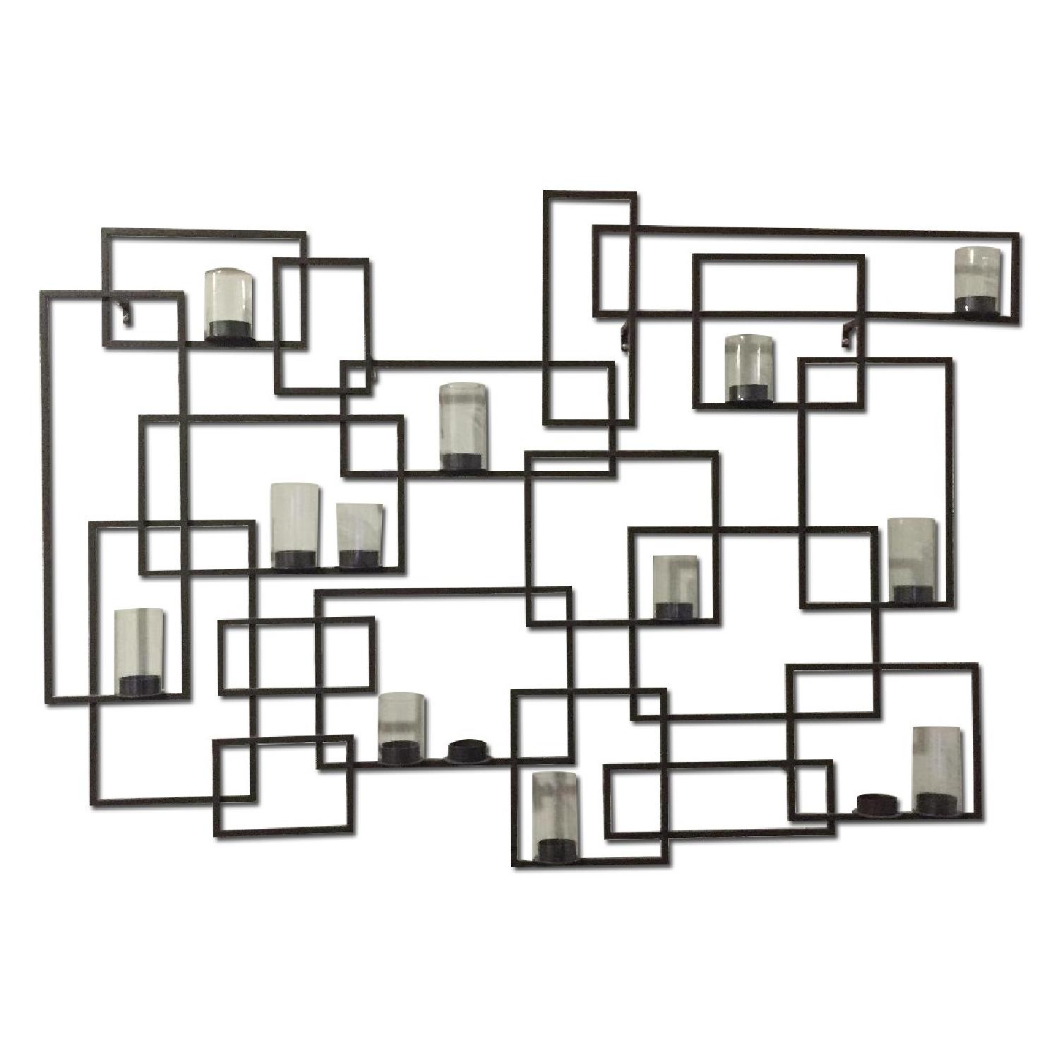 Seller's Notes:Abstract geometrics form a mural of candlelight. Candleplates hold eight tall and six short glass votives that accommodate cupped tea lights. Metal wall art frame in an antiqued bronze. Please note that I am missing two of the glass votives but they can be purchased separately from Crate & Barrel. Purchased a year ago but moving so must sell. Here is the link to crate & barrel website with this item: http://m.crateandbarrel.com/circuit-metal-wall-candle-holder/s553255