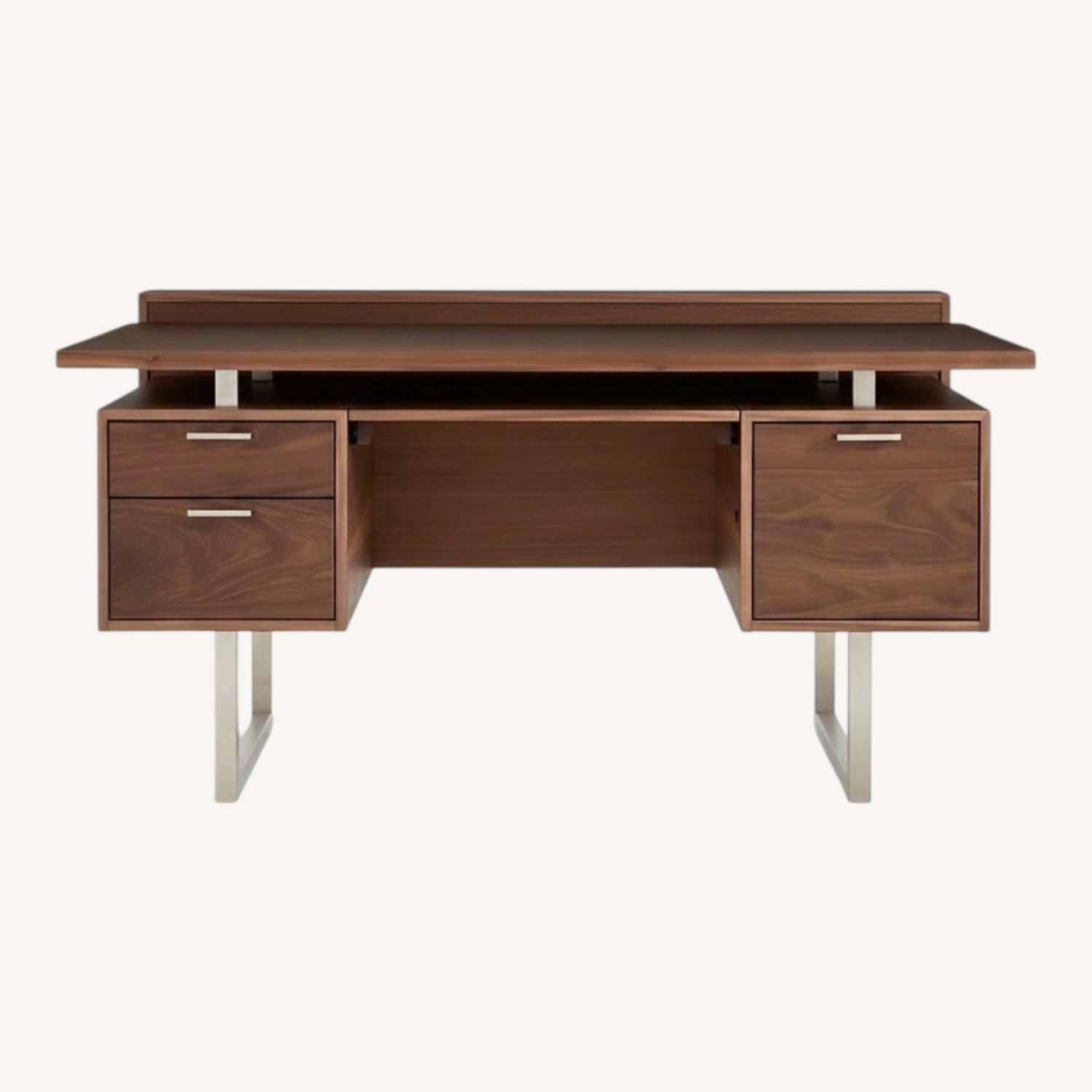 Our exclusive Clybourn desk's walnut veneer top floats on brushed stainless steel supports for a striking, architectural look that conceals a functional, integrated slide-out shelf below. Designer Blake Tovin's mid-century modern design suspends two walnut storage drawers opposite one legal-letter file with brushed aluminum pulls. Impressive from all angles, the desk's finished back allows it to work mid-room for a flexible office arrangement.