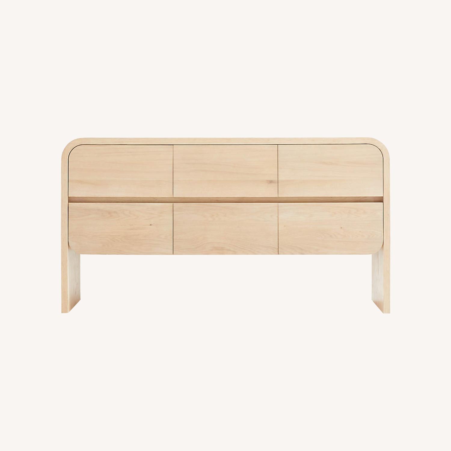 Seller's Notes:*BRAND NEW, NEVER USED* This dresser is in pristine condition. We just realized it does not fit in our space. Description from Crate & Barrel: Classic bedroom storage defies expectations in our exclusive, design-forward dresser. Made of solid white oak and white oak veneer, the dresser floats a rounded rectangle of six drawers in the curving embrace of a waterfall frame. The natural finish highlights the lively wood grain, showcased in the seamless design and flat-front drawers. Pair with our Leanne Ford-designed Cortez nightstand for a coordinated look. Curated and crafted around the world, our first furniture and decor collaboration with design star Leanne Ford brings her cool, effortless vibe home to you. Cortez Natural Floating Dresser 32"H 60"W 18"D Designed by Leanne Ford FSC ®-certified solid white oak, white oak veneer and engineered wood with natural finish 6 soft-closing drawers Levelers