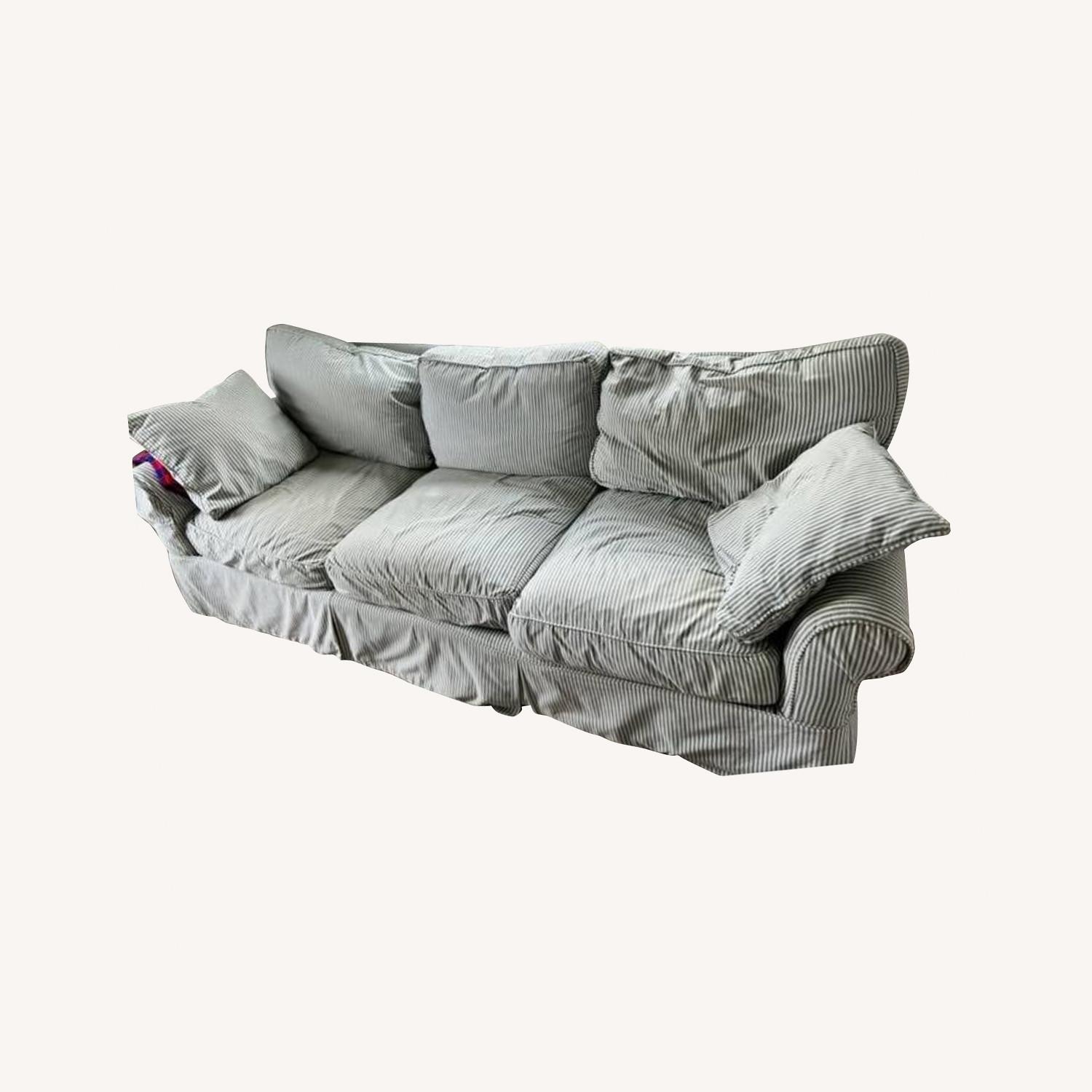 Seller's Notes:Super comfy Crate & Barrel couch, fitted with beautiful, striped custom slip covers. Bring a touch of farmhouse chic to your living room! Dimensions: 84"L x 36.5"D x 29"H.