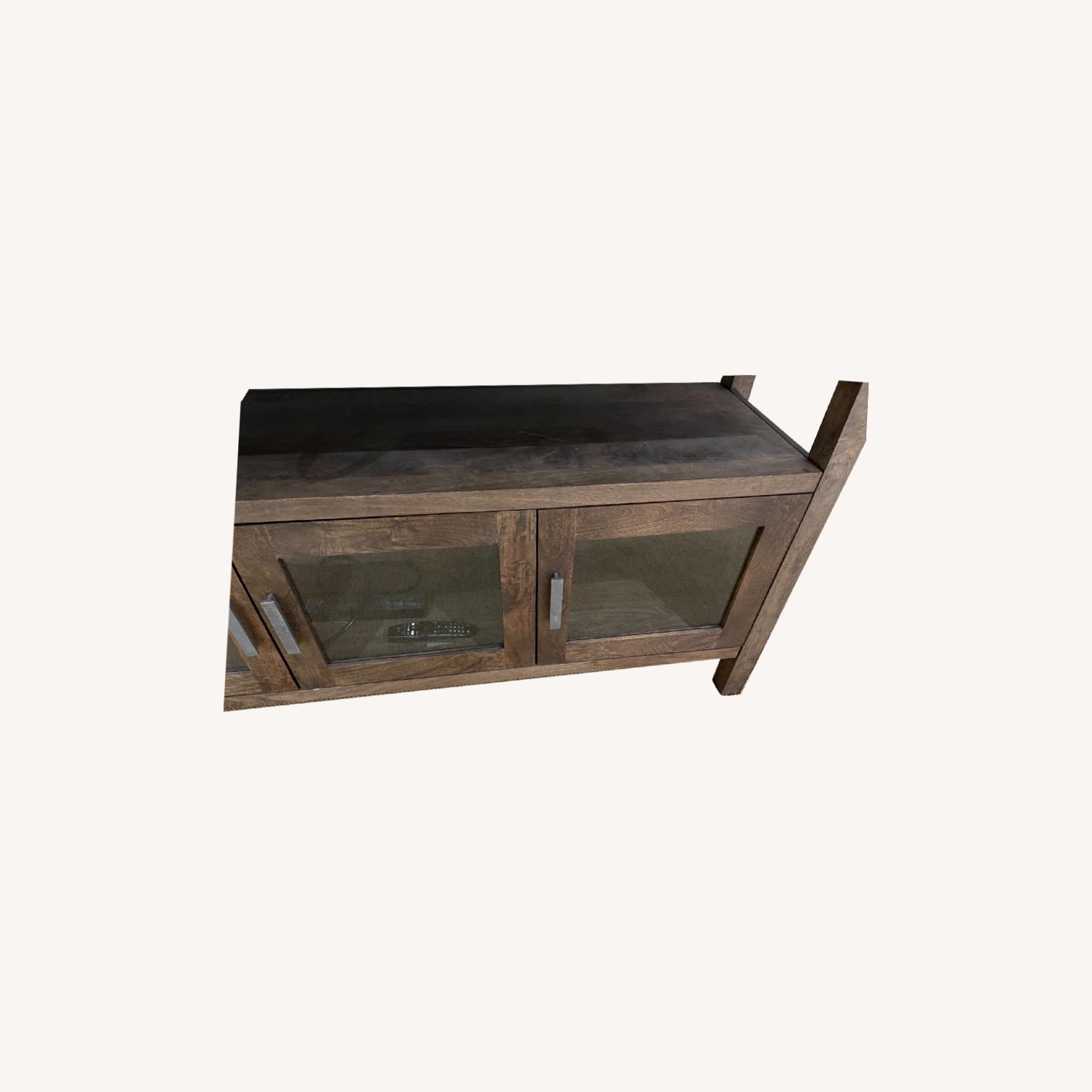 Seller's Notes:This fabulous 5 foot credenza makes for great storage and the metal top will hold a very large tv. Standing 6 inches off the floor each door is 18 inches wide and the shelf above the cabinets has 7 inches of headroom.