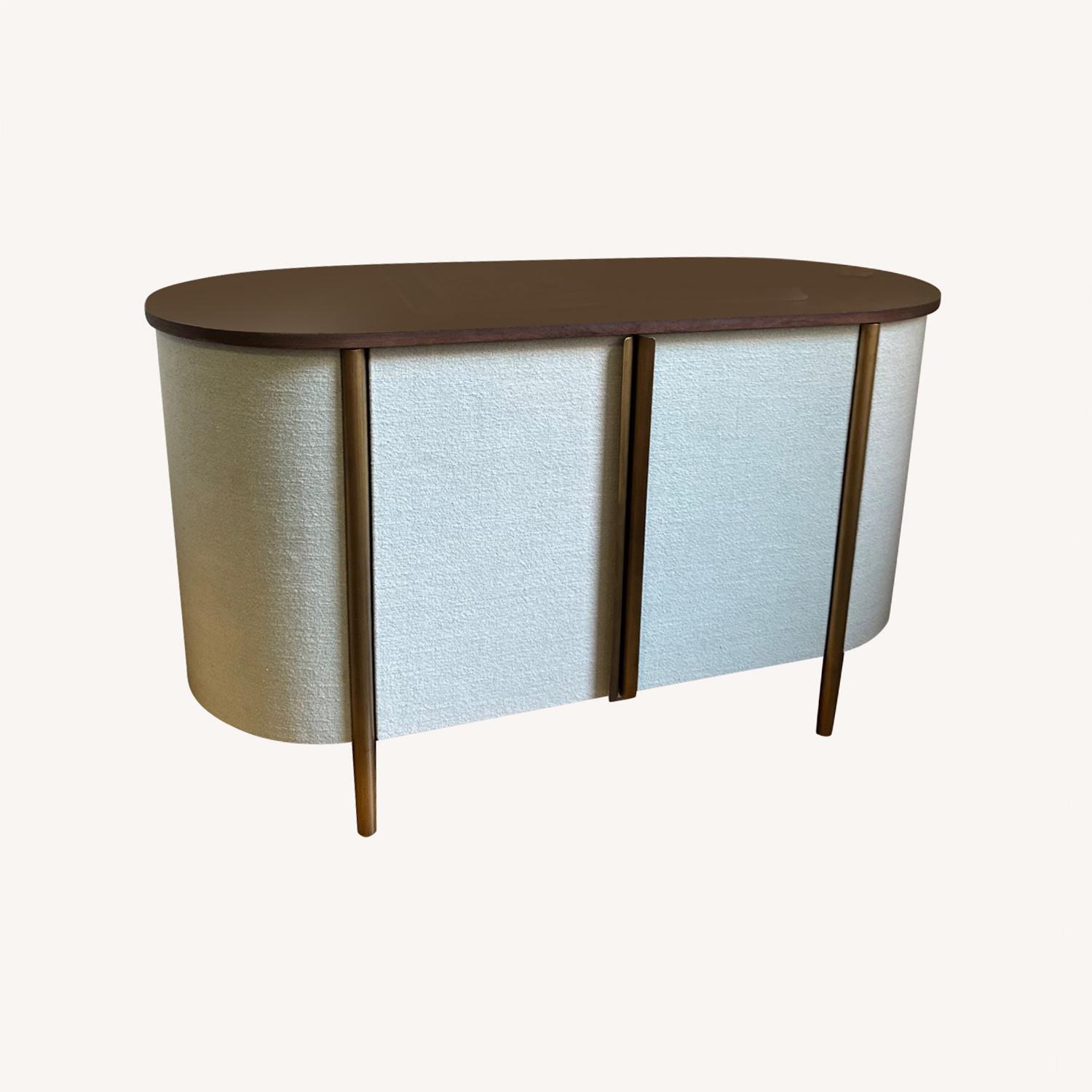 Inspired by the playfully clean lines of Danish modern furniture, our Avedore media console mixes materials in a design-forward oval silhouette. The fabric-wrapped exterior enchants with soft texture and a whisper of sage green, in stylish contrast to the tubular brass frame and richly grained walnut veneer top. Open the double-door cabinet to find a gorgeous interior of mahogany certified by the Forest Stewardship Council (FSC), the environmental gold standard for responsibly managed forests. Designed for us exclusively, the media console is perfectly scaled for smaller living or dining rooms.