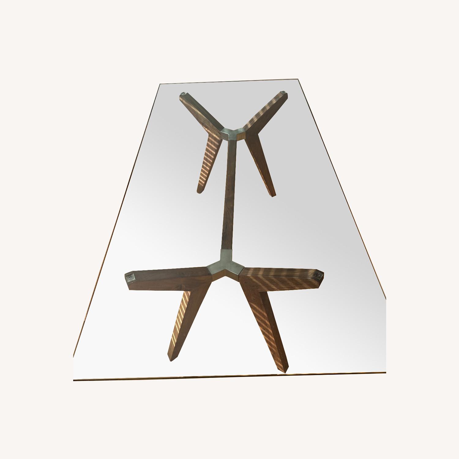 Seller's Notes:The statement-making Strut table offers clean, modern lines for the home office or dining room. A substantial glass top floats on dramatically-angled hardwood legs with a warm matte bourbon brown stain. ^ A crossbar support connects at the legs with unexpected steel joints. Striking from every angle, the versatile Strut can fit up to six as a dining table. The Strut Bourbon 70" Work Table is a Crate and Barrel Exclusive.