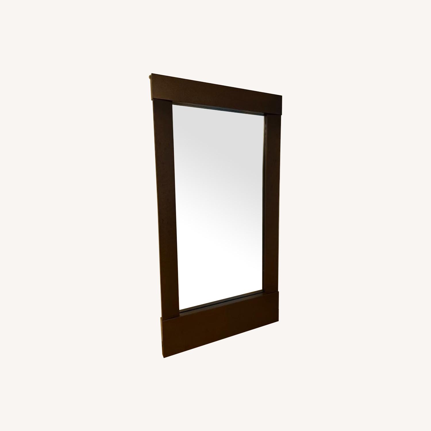 Architectural modern mirror leans against the wall with attitude in a sleek, asymmetrical stainless steel frame finished in warm bronze. The dark frame creates a bold border around the reflective glass. This rectangular mirror, a Crate and Barrel exclusive, can be leaned or mounted vertically and horizontally on the wall and is safe to hang in the bathroom.