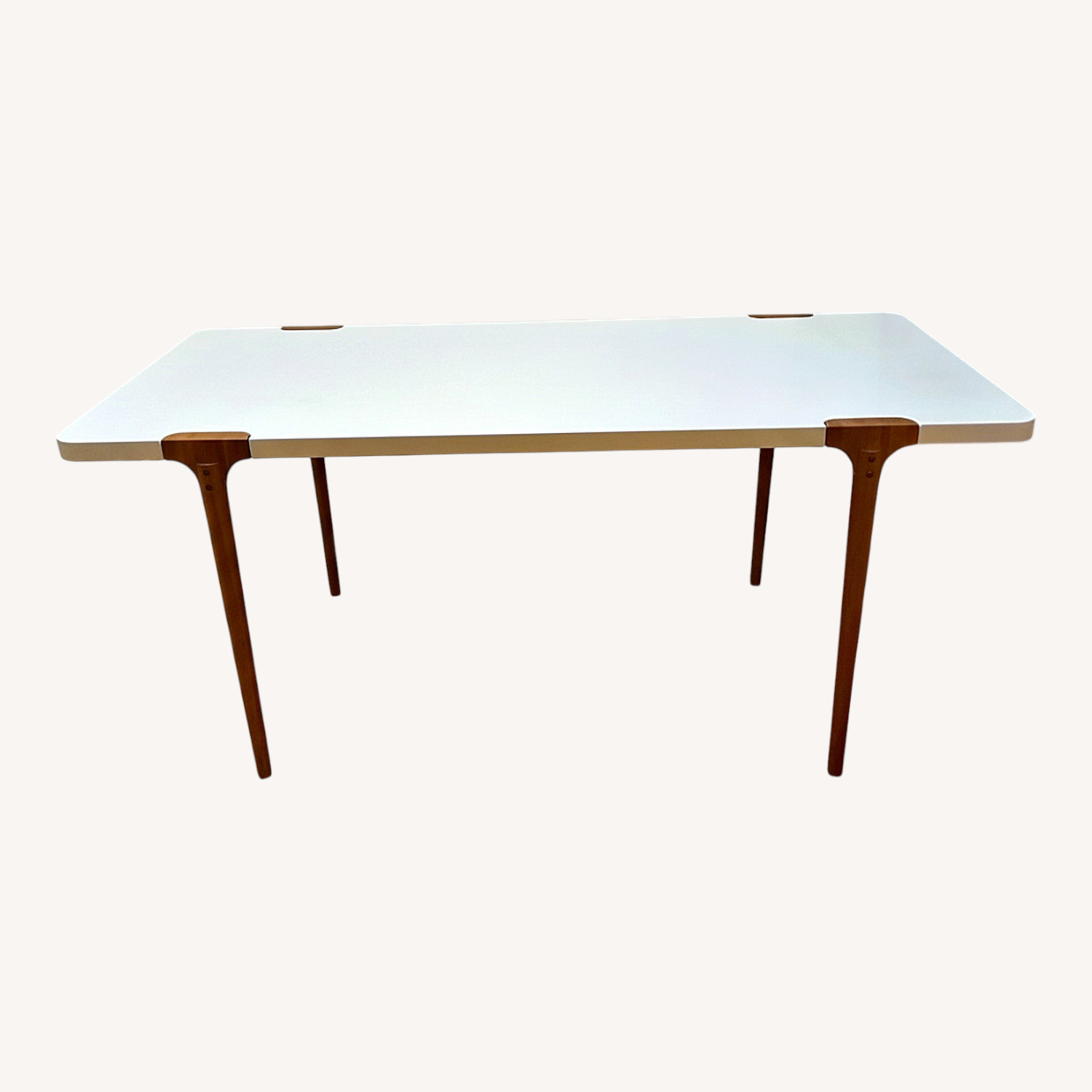 Seller's Notes:MCM clean minimalist aesthetic rectangular dining table or work table : white top some minor scratches but overall in good shape. Legs oak finished in clear lacquer One previous owner legs removable for easy transport. Pickup by appt on Upper Westside.