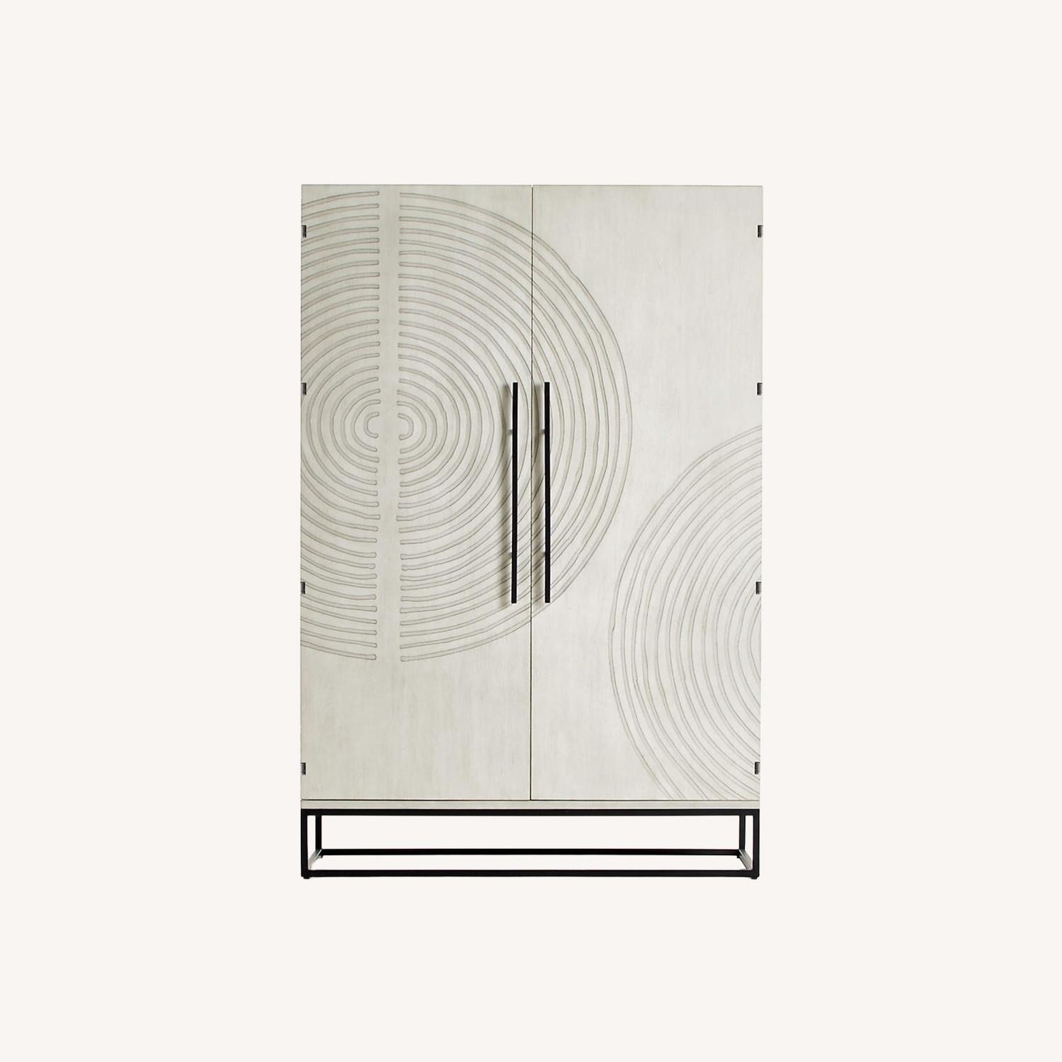 Transform your space with Circulus, a furniture collection reimagined with one-of-a-kind artistry, rhythmic pattern and a light wood finish. Incised lines with a hand-drawn look radiate out in expansive circles across the door fronts of this impressive cabinet. Accented with slim black iron pulls that match the open-frame base, the armoire opens to three shelves for ample storage. Made of birch veneer, the cabinet makes the most of its artisanal craftsmanship with a white birch finish that solves household storage with a fresh, modern look. Each piece is unique.