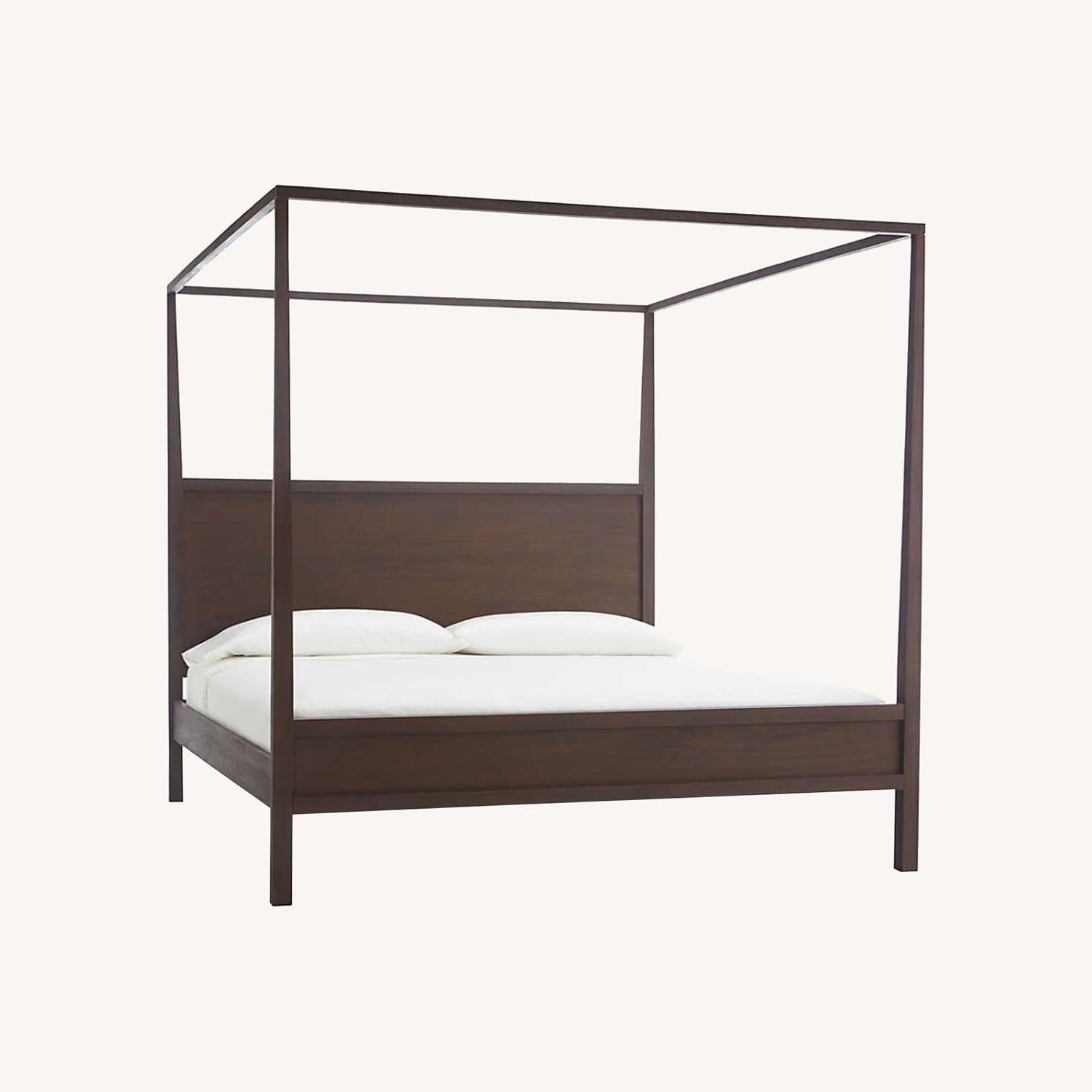 Seller's Notes:Beautiful king canopy bed in excellent condition. We’re the first and only owners, it came directly from Crate + Barrel’s warehouse into our bedroom. Only moved once, fully disassembled and reassembled by professionals. All original parts and hardware included, from a pet-free, smoke-free home. Original description from Crate + Barrel’s website included below: Keane streamlines the traditional canopy bed into an open, airy cube of beautiful mahogany. Architectural but never formal, the canopy bed features ever-so-slightly tapered posts anchored by simple panel head- and footboards. The king bed's rustic brown finish lends decor-friendly warmth. Our best-selling Keane collection is a Crate & Barrel exclusive. • FSC ® mahogany with rustic dark brown finish and engineered wood • Slat support system makes box spring optional • Expansion and contraction may occur with seasonal changes in humidity • Levelers •Made in Indonesia