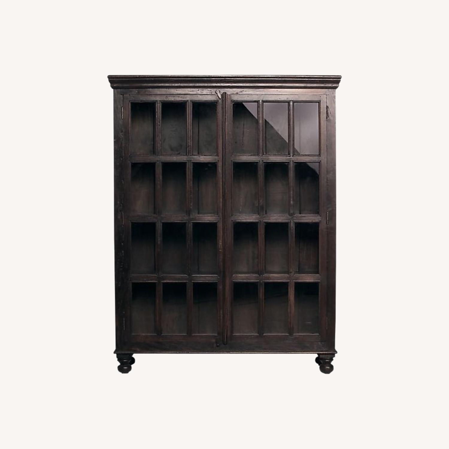 The rustic charm of Faulkner is defined by its British Colonial origins: handsome crown moulding along the top, traditional ball feet and wooden hasp closures. Plantation-grown hardwood is hand-finished with a rich dark brown stain lacquer and hand-waxed topcoat. Four fixed shelves sit behind double French doors with 24 individual polished glass panes.
