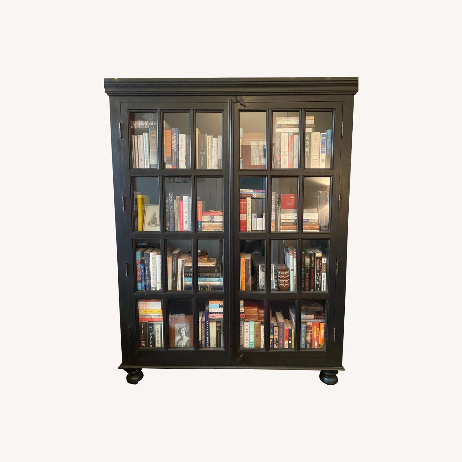 Seller's Notes:The rustic charm of Faulkner is defined by its British Colonial origins: handsome crown moulding along the top, traditional ball feet and wooden hasp closures. Plantation-grown hardwood is hand-finished with a rich dark brown stain lacquer and hand-waxed topcoat. Four fixed shelves sit behind double French doors with 24 individual polished glass panes.
