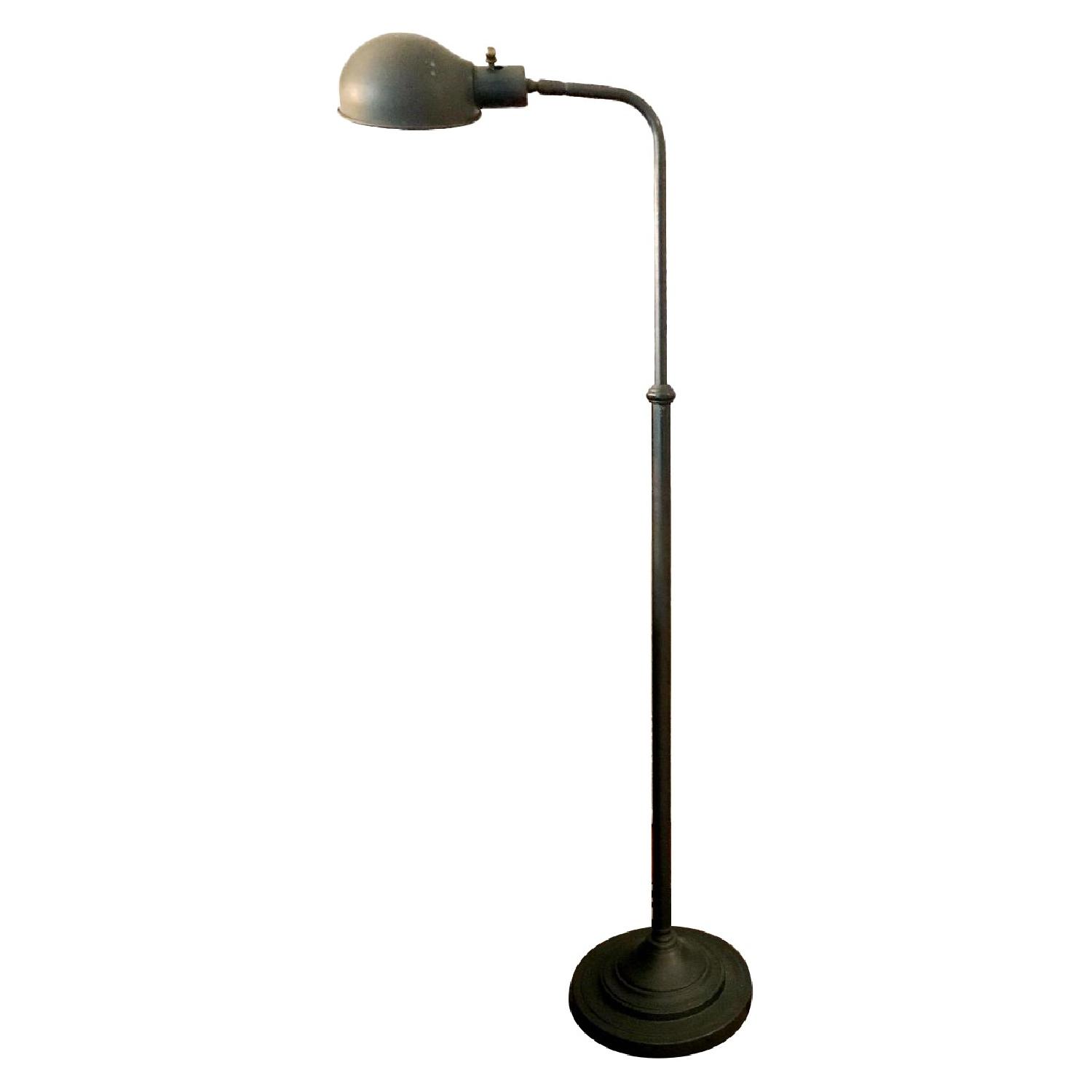 Seller's Notes:Crate & Barrel floor/library lamp. Adjustable height. Dark grey/bronze color. The shade has a blemish. It gives it character. Demensions represent the length of the shade to post, width is the base of lamp and height is the max the lamp can be raised. The height is adjustable.