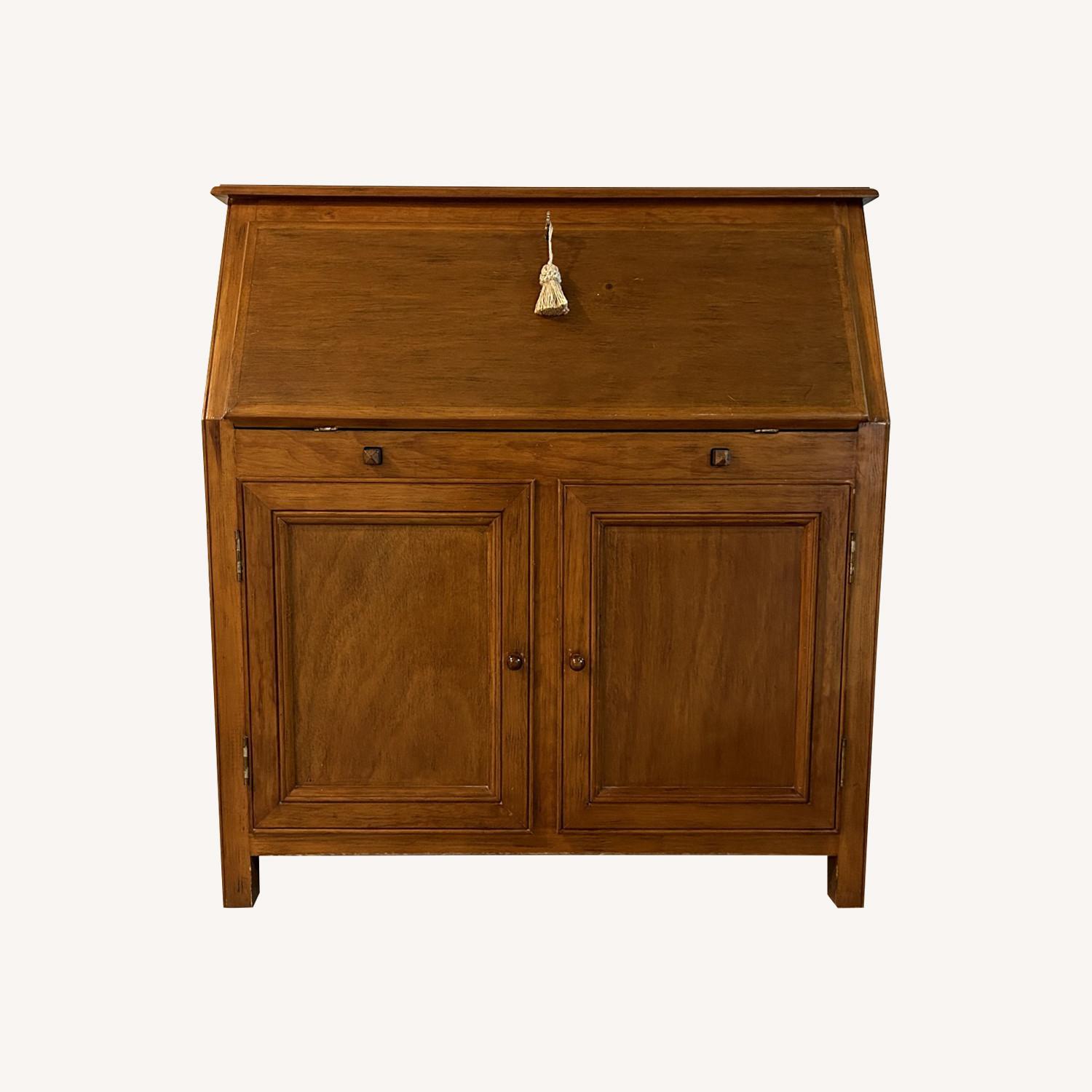 Seller's Notes:Solid wood secretary desk with fold down top. Excellent condition. Hardly used. Four drawers on top. Large cabinet below the desk with one shelf. Holds a lot of items. Can be locked for security. Very nice looking piece.