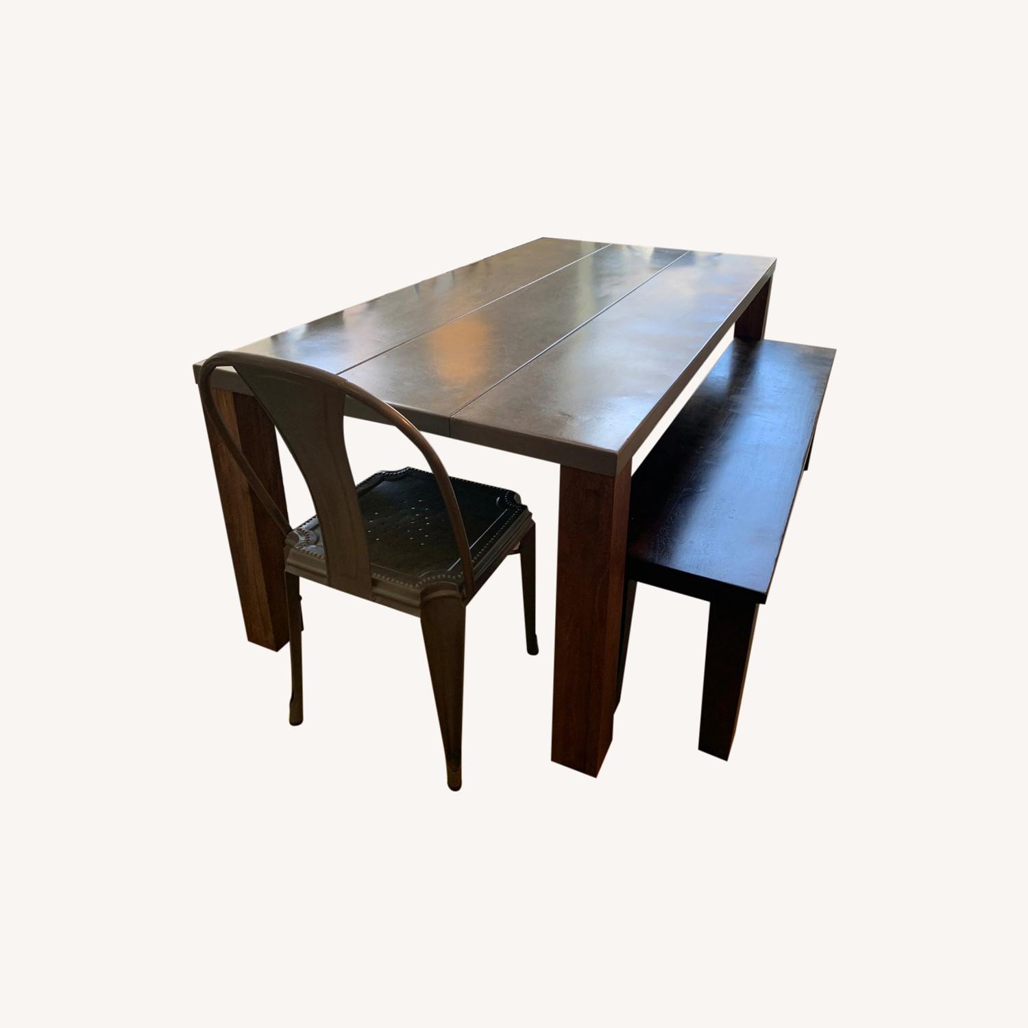 Seller's Notes:This industrial-modern dining table from Crate & Barrel is a modern combination of wood and metal that elevates any dining space. The top is made of milled steel that's been hot-dipped in zinc to create an exceptionally durable and easy-to-clean surface with a one-of-a-kind patterning. The sturdy legs are made of solid mango wood. Up to 8 people can comfortably fit (3 on each side and 1 on each end). We have owned the table for three great years and made many great memories sitting around it with family and friends. However, we will be moving in the near future and this table will not fit well in our future apartment. The table is in very good condition owing to the quality materials used. There is a slight discoloration on one end of the table, but is otherwise in like-new condition. This listing is only for the dining table, however, please find my other listings if you are interested in the chairs and bench shown in the photos.