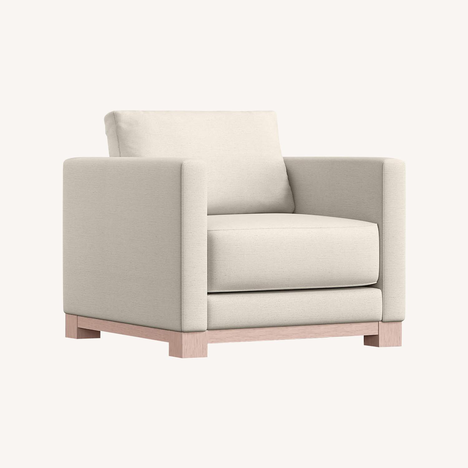 Seller's Notes:2-year old Gather Wood Base 38" Chair in Performance Classic Twill Fabric. Color is Tribute Fabric in Quartz. Used as nursery glider, in overall good condition, some staining on one side of cushion only (can be flipped and hidden). Currently retailing for $1,500 at Crate & Barrel.