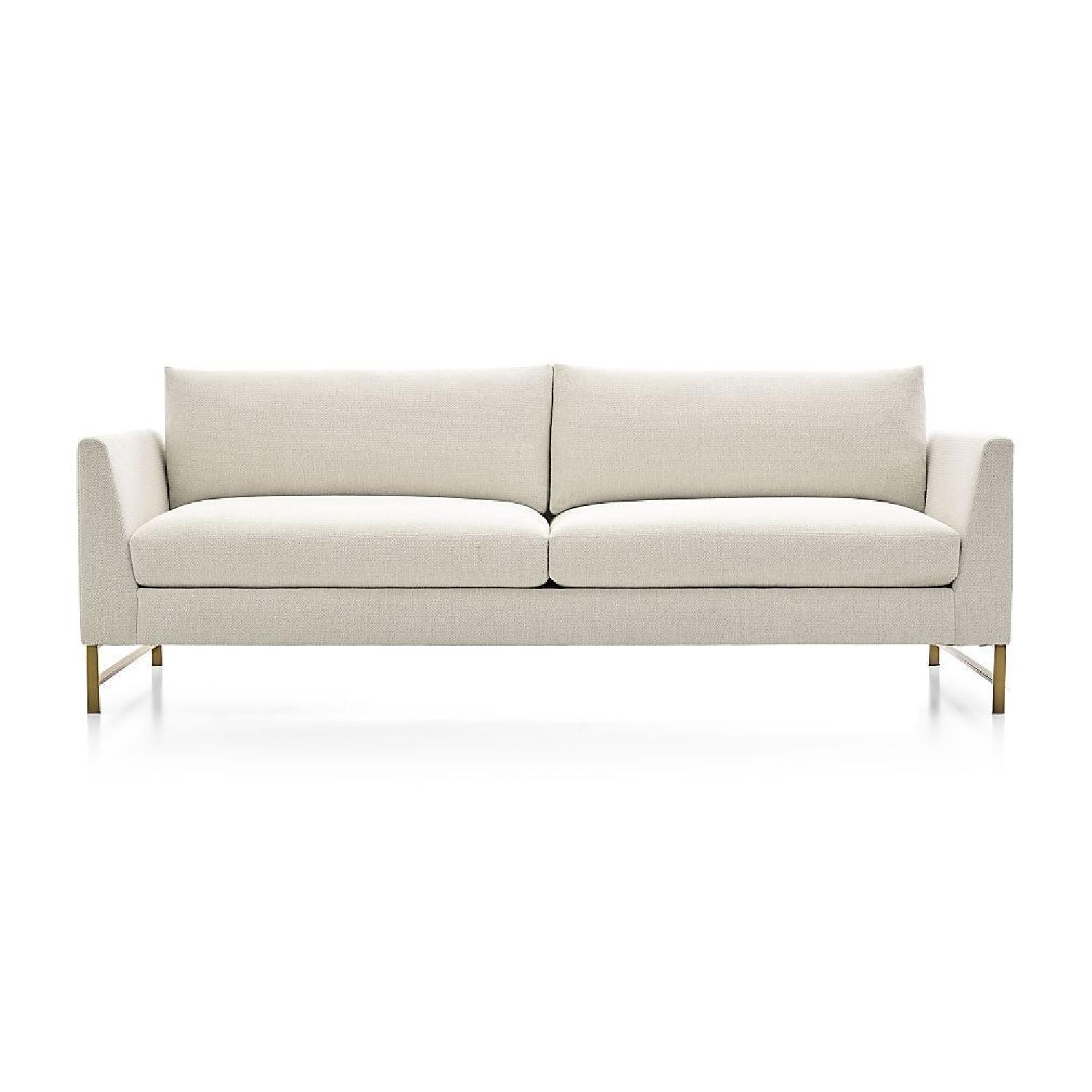 Seller's Notes:1st owner and purchased directly from Crate and Barrel. Owned for about a year. Carefully used in pet and smoke free household. Selling due to relocation. Genesis sofa (brushed brass base, snow color) retails for $3,499. Seat: Width: 80", Depth: 27", Height: 18", Leg: Height: 7" Overall Dimensions: Width: 90", Depth: 34", Height: 26" Overall With Back Cushion: Height: 32" Arm: Width: 5", Depth: 34", Height: 26" Crate and Barrel Description: Characteristic of true modern design, stunning Genesis invests clean, contemporary lines with pure liveability. Streamlined yet cozy, Genesis angles slim track arms toward deep-seated back and seat cushions, and its brushed brass base anchors the sofa in modern style. Easy-care olefin yarn brings the room-brightening effects of pure, white upholstery to even the most casual of rooms in a fabric that cleans up easily. • Certified sustainable kiln-dried hardwood to prevent warping • Plated stainless steel with brushed brass finish • Synthetic webbing suspension • Soy-based polyfoam wrapped in fiber encased in downproof ticking