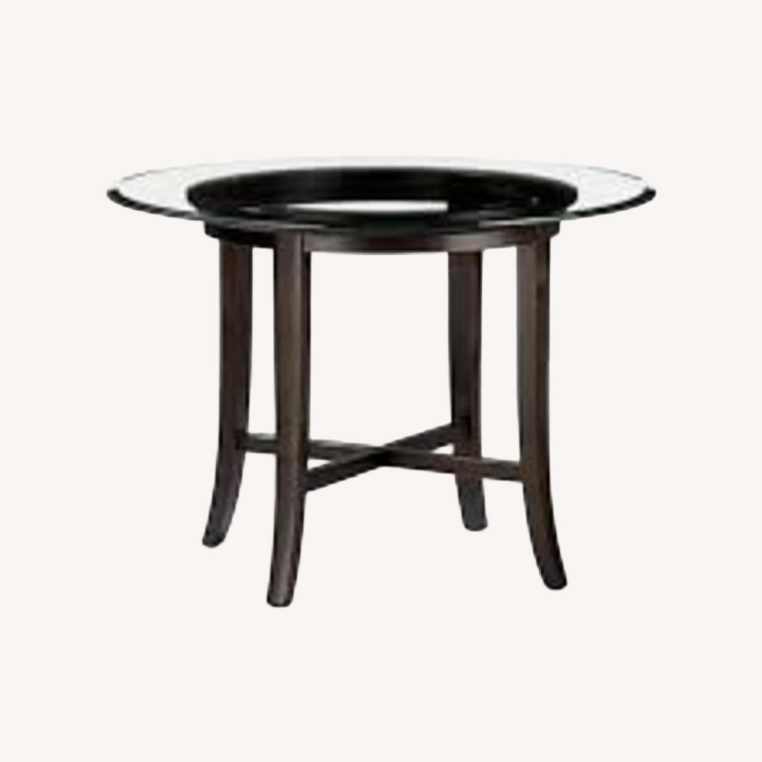 Seller's Notes:This Crate & Barrel round dining set brings warmth, texture, and effortless style to any kitchen nook or casual dining space. The table features a substantial dark wood base with four sturdy pedestal legs and a sleek round glass top that keeps the look open and airy. The glass is in excellent condition, beautifully showcasing the rich wood base beneath and making the space feel larger and brighter. The set includes five woven wicker chairs with comfortable, neutral-toned cushions that pair perfectly with the table’s warm finish. The woven texture adds a relaxed, coastal-inspired feel while still being polished enough for everyday dining or entertaining. This set has been gently used in a townhouse breakfast nook and remains structurally solid and very functional. There are minor cosmetic scratches on the wood legs and some staining on the cushions consistent with age, but nothing that detracts from its charm or usability. With its classic Crate & Barrel quality and timeless design, this is a fantastic opportunity to own a well-made dining set at a fraction of the original price. Perfect for someone looking to add character and casual sophistication to their space.