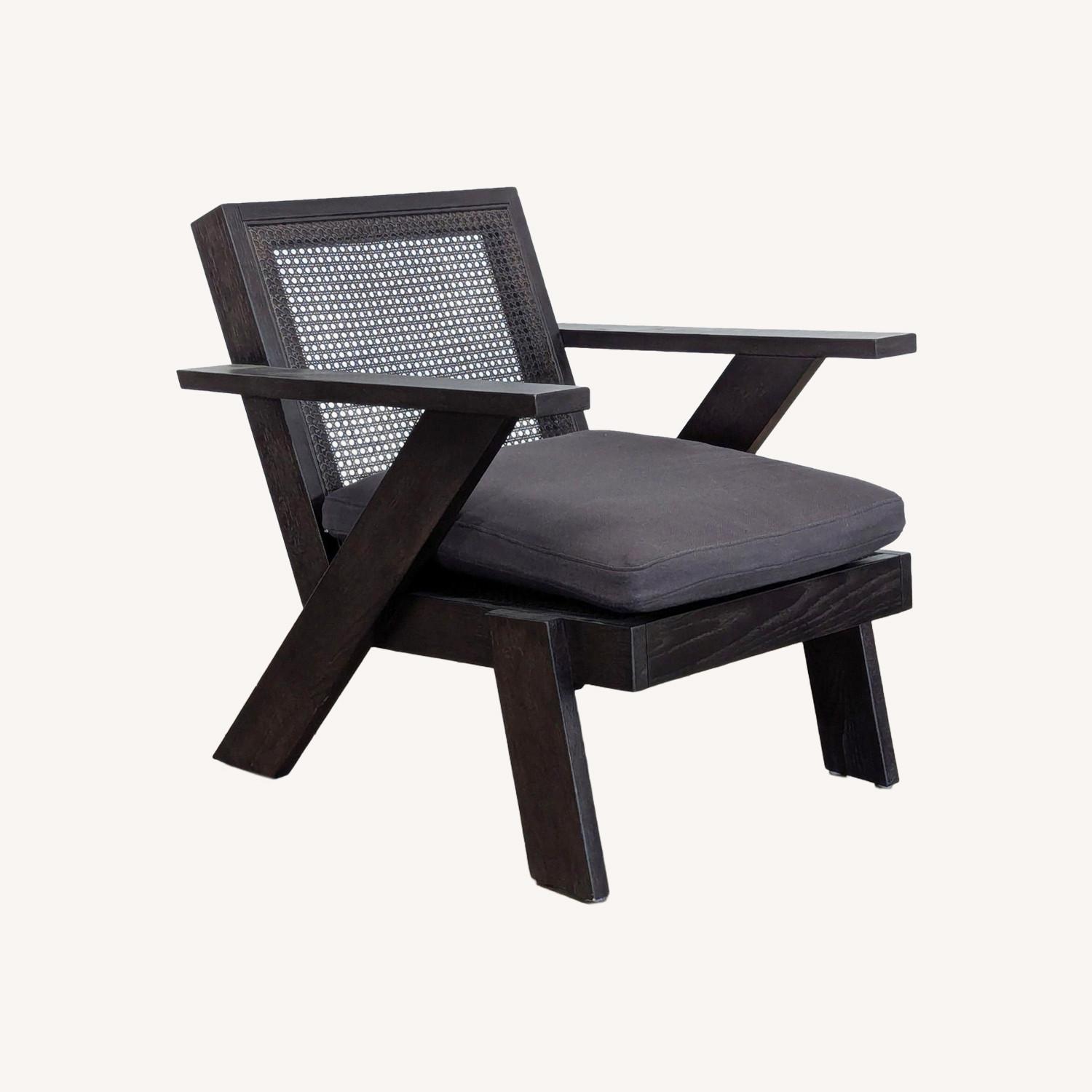 Seller's Notes:The Crate & Barrel Jeannie Cane Accent Chair features a solid oak frame with woven cane seating and a charcoal finish, offering a modern yet airy design.