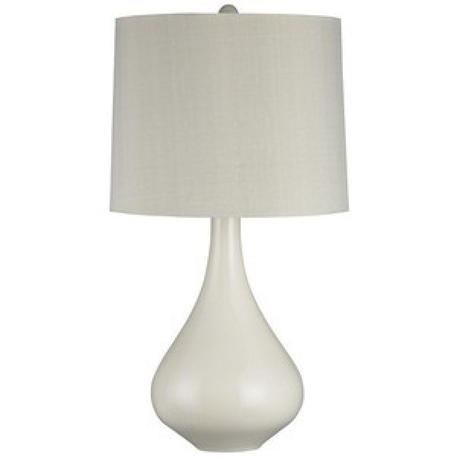Seller's Notes:This lamp was purchased in August 2012 and is in great condition (no visible signs of wear and tear). I'm moving and will be buying new furniture, so don't need this lamp anymore Kathryn Table Lamp. 15" dia. x 27.5"H Porcelain base with creamy ivory crackle glaze Creamy ivory silk shade Three-way switch Energy efficient bulb included (requires up to 30W CFL or 150W incandescent bulb) 8' translucent cord Made in Portugal Note: This item is UL-Listed and manufactured in compliance with U.S. standards. If you are purchasing this item for use outside of the U.S. or Canada, use only with the appropriate outlet adaptor and voltage converter for your country. Do not plug into an electrical outlet higher than 110-120V as this could result in fire and/or injury. Overall Dimensions Height: 27.5" Diameter: 15" Shade Height: 11" Diameter: 15" Top Of Shade Diameter: 14" Bottom Of Shade Diameter: 15" Harp Height: 11"