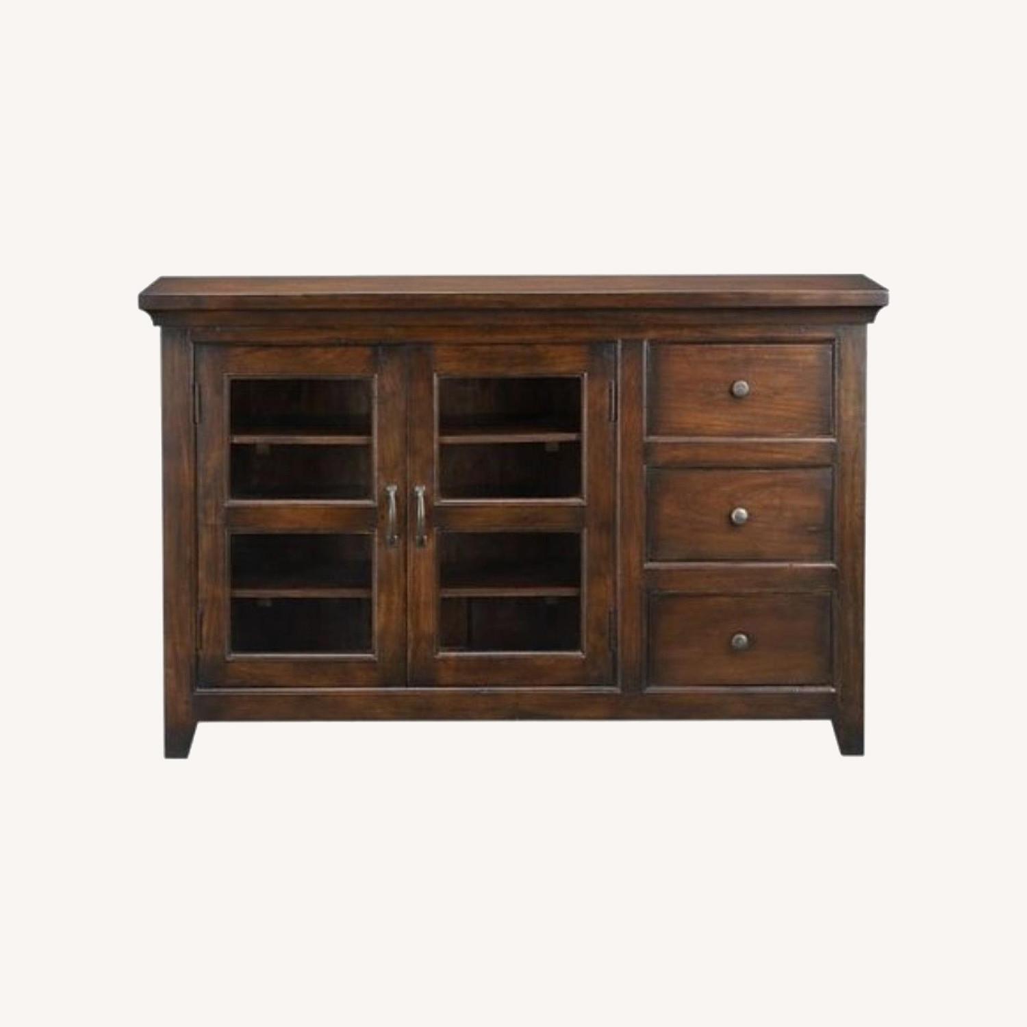 A versatile combination of open and closed spaces shows off display, conceals storage. Handcrafted of richly textured acacia wood, with a beautiful distressed finish in warm brown with black accents. Versatile configuration with double glass-paned doors and three drawers stands in as media center, sideboard or general storage piece. Variation in knots and open grain, crown moulding and traditional iron hardware with an antiqued bronze finish add even more character.