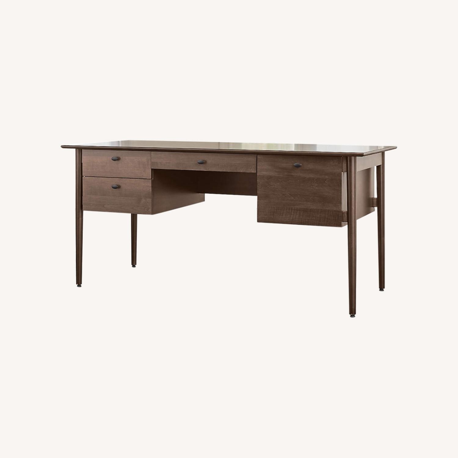Seller's Notes:Kendall puts solid maple and maple veneer to work in a clean-lined desk that references classic mid-century details. Designed by Black Tovin of Tovin Design, the cocoa-stained desk suspends a drawer sized for letter or legal files, a center drawer and two stacked storage drawers between gracefully rounded legs. Simple round steel pulls are given a matte black finish. The Kendall Cocoa Writing Desk is a Crate and Barrel exclusive. Kendall Cocoa Desk 65"Wx29"Dx30"H Designed by Blake Tovin of Tovin Design Solid maple, maple veneer and plywood with cocoa finish 4 drawers (1 for letter and legal files) Full-extension ball-bearing glides Steel pulls with matte black finish Naturally occurring grain, knots and mineral deposits are unique to each piece