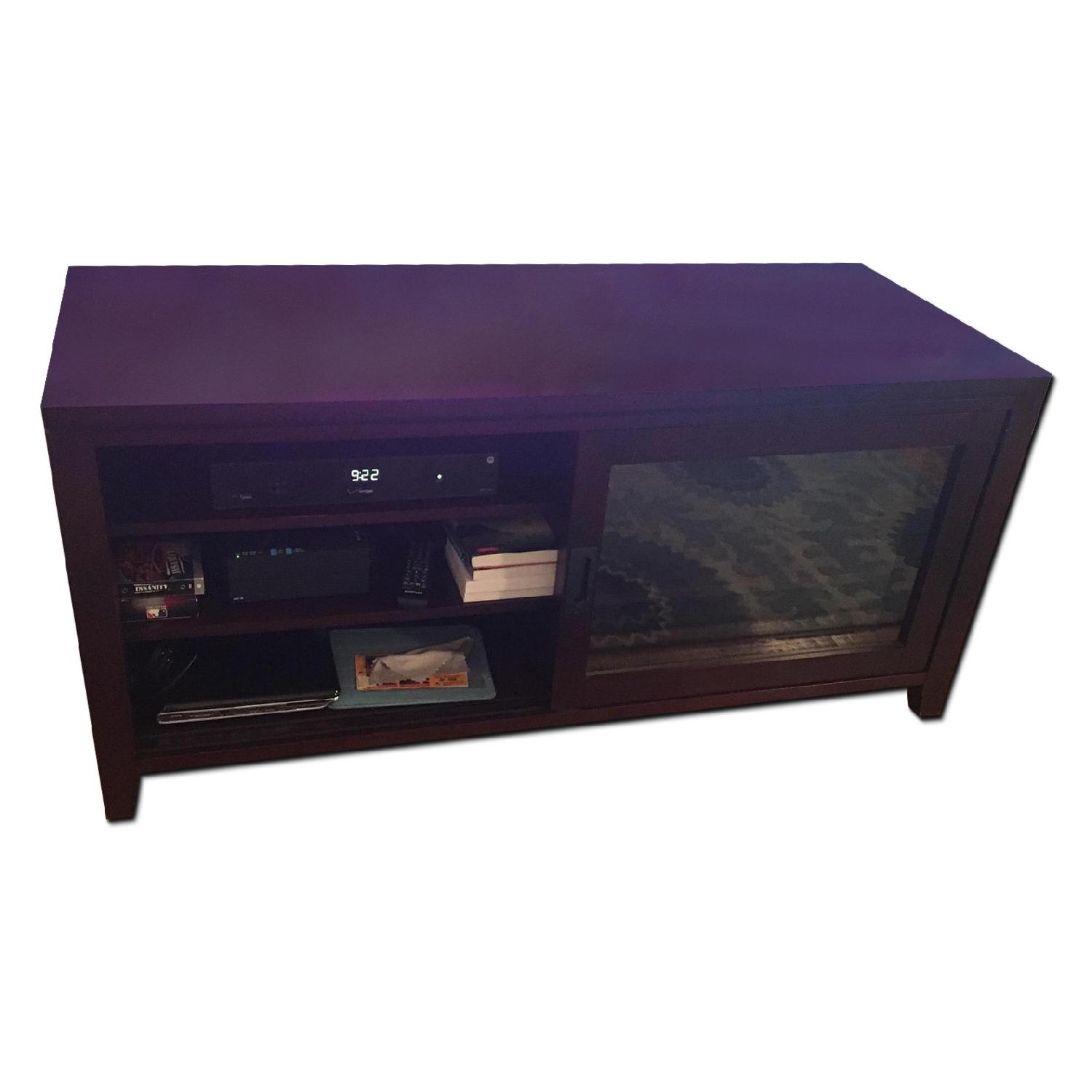 Seller's Notes:Kingston 52" TV Stand, approx 3 yrs old. Original purchase price was $450. Stand has a few, hard to notice scratches on top surface and a nicked corner. However, once you put your 50" flat screen on top, everything magically disappears! Two glass sliding doors underneath with two adjustable shelves on each side (can hold up to 6 components) with cutouts in the back to run wiring. Dimensions are 52w x 24h x 21d.