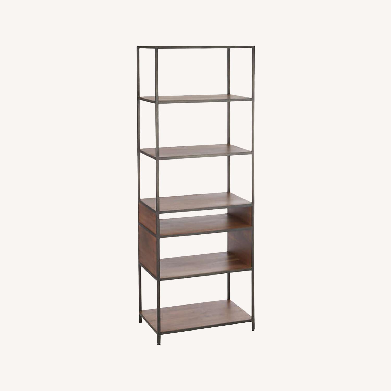 Seller's Notes:Shelves of solid walnut are set within slim, architectural iron frames in the clean-lined Knox collection. The versatile design works well in any room. Tall bookcase stacks walnut shelves at varying intervals to add visual interest and to accommodate a wide range of book sizes and display items. The Knox Tall Open Bookcase is a Crate and Barrel exclusive. The shelves are deep enough for folio baskets or milk crates for storage. Knox Tall Open Bookcase. 28"Wx18"Dx78"H Solid walnut Iron tube frame with black finish Levelers
