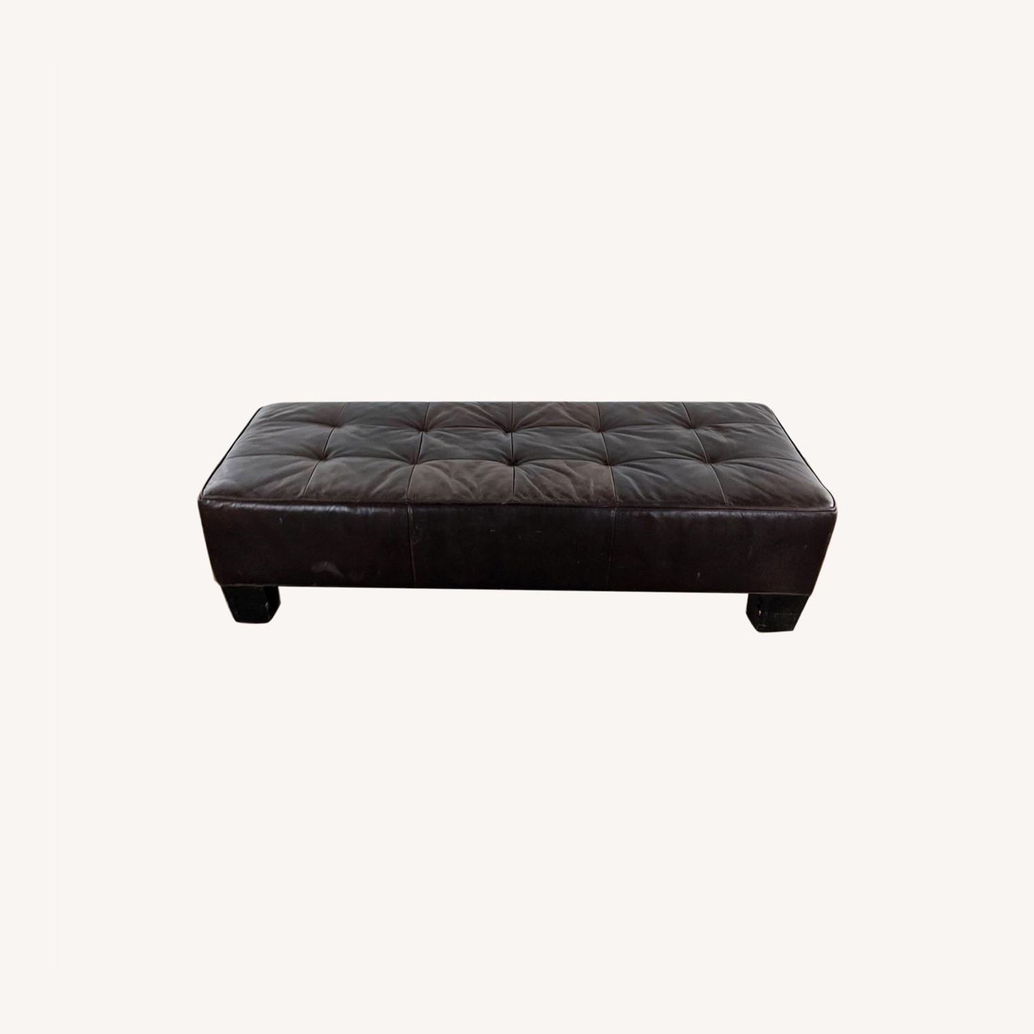 Seller's Notes:Contemporary, Dark Brown "Worn In" Rectangular Leather Ottoman With Tufted Top. Brand: Crate & Barrel. Dimensions: 58x25x16.