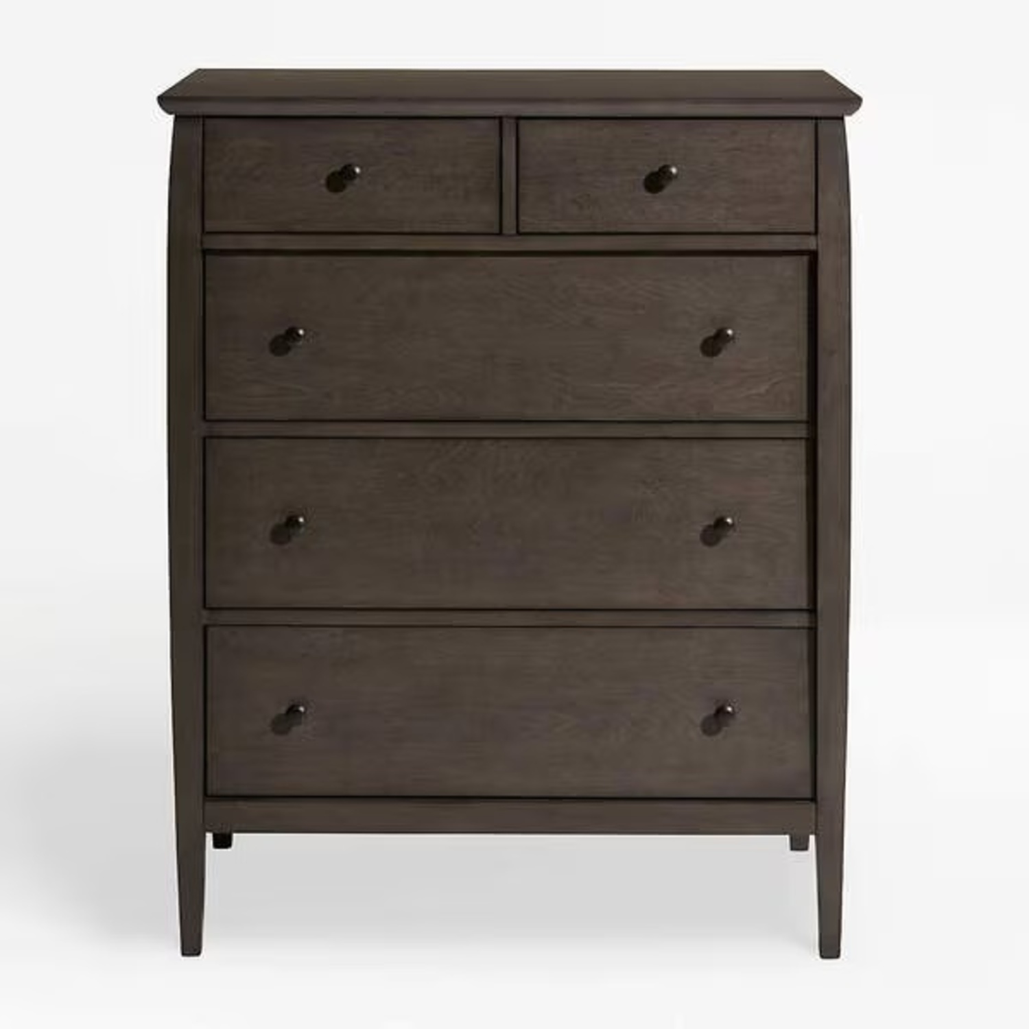 Our Mason chest of drawers scores style points by balancing clean lines with a dramatic, smoky grey-brown finish, while delivering plenty of room for bedroom storage. Made of solid poplar and birch veneer, the chest sits high on legs that take a turn with tradition, flowing right into the frame and curving in at the top. • Designed by Blake Tovin of Tovin Design • Solid poplar, birch and hardwood veneers, and engineered wood with a smoky grey brown finish, sealer and clear lacquer topcoat • Five drawers with metal side-mounted glides • Metal knobs with dark graphite grey finish • Levelers • Anti-tip hardware included • Made in Vietnam Mason 36.5" Shadow Grey 5-Drawer Tall Dresser