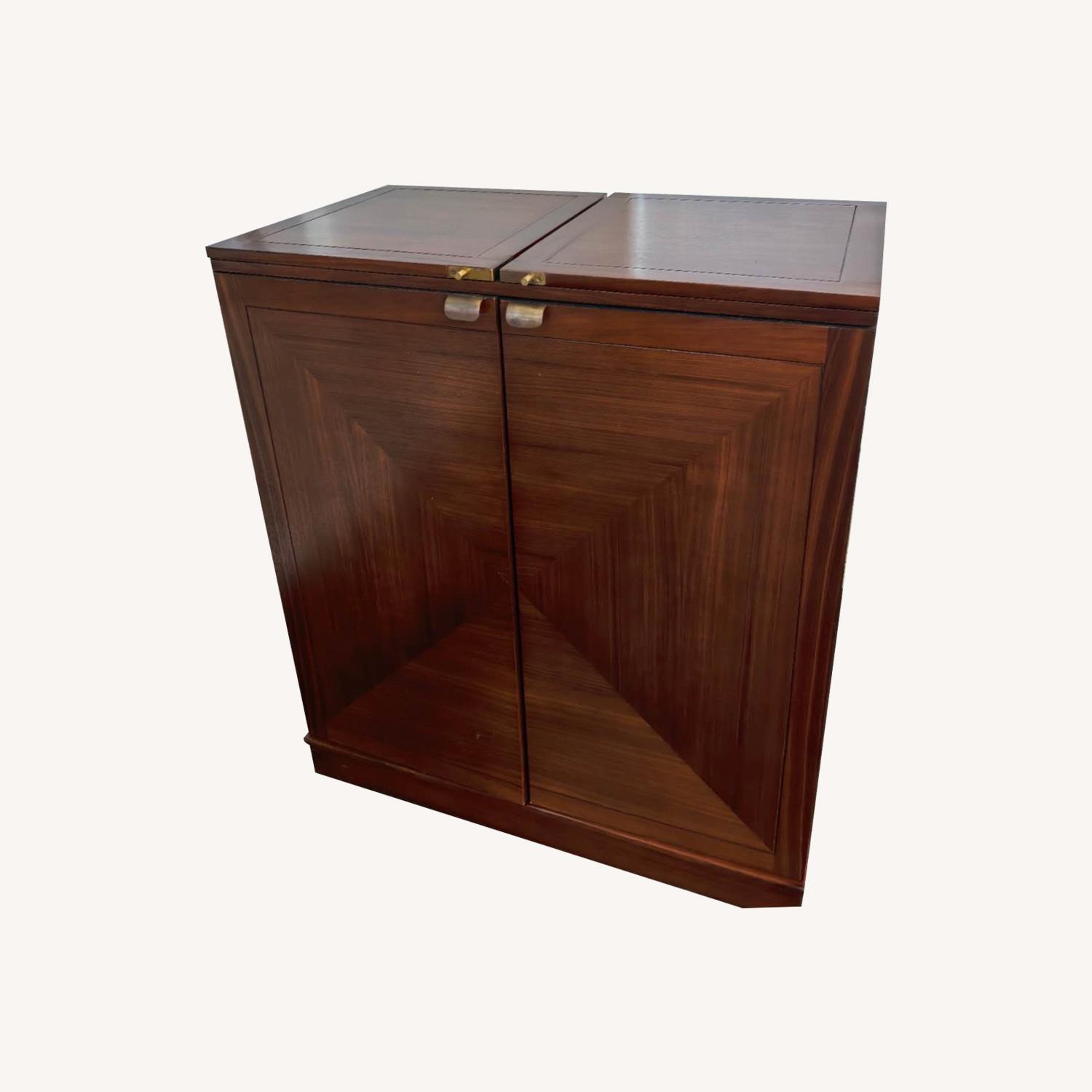 Parquet panels piece together gorgeous grain and color in this walnut bar cabinet that's ready to unfold for instant entertaining. With a flip and pull of the clean-styled brass hardware, the bar is open for business. Finished on all four sides, Maxine can float in a room. Its wood top folds out to an expanded work surface inset with black laminate. The interior is well equipped with racks for stemware, shelves for beverage bottles and a lower rack for 16 wine bottles. Open shelves and drawer box hold bar tools, ice buckets and supplies. The Maxine Bar Cabinet is a Crate and Barrel exclusive.