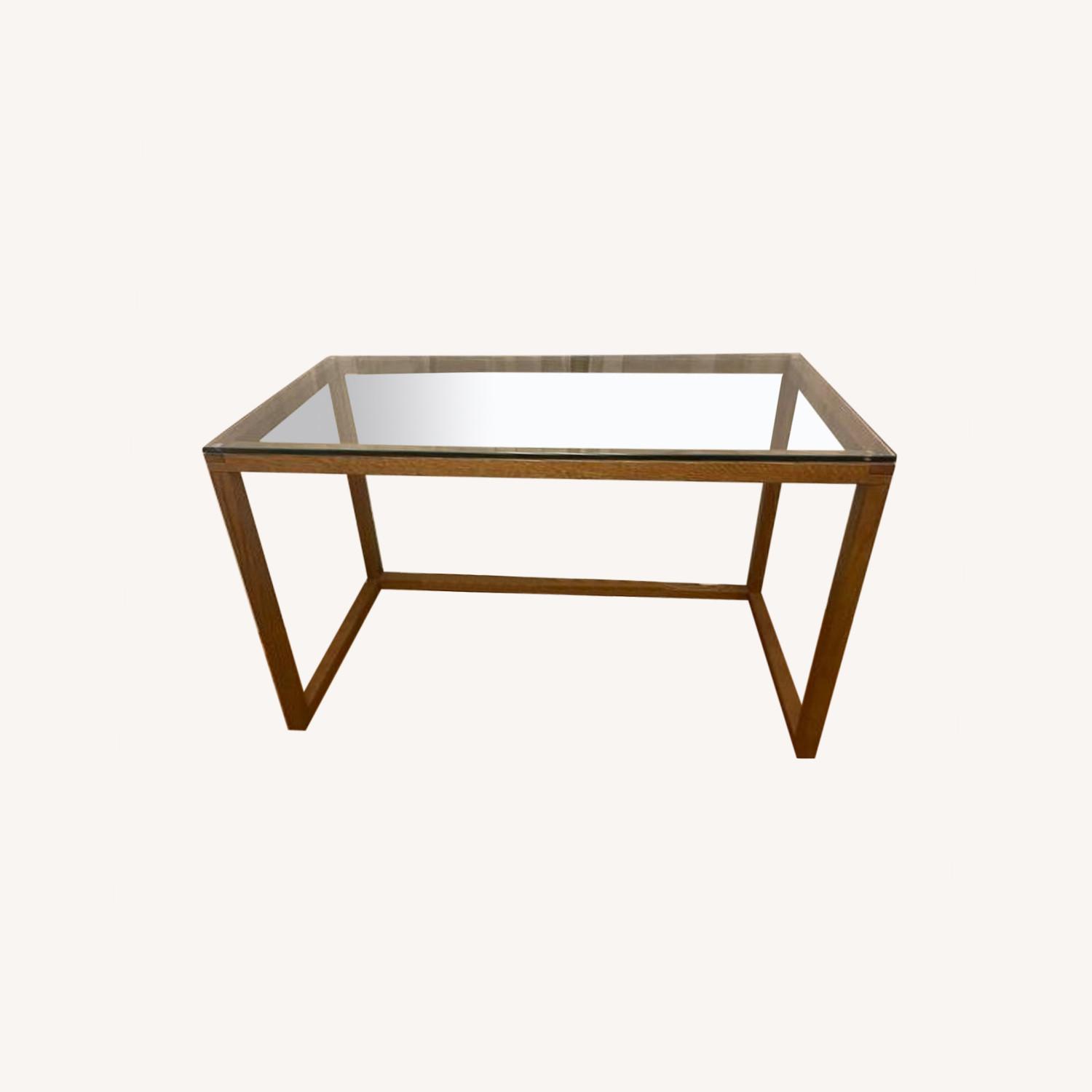 Seller's Notes:Minimalist style desk with tempered glass top and wooden frame. Approximate dimensions are 4 ft wide x 2 ft deep x 30 in tall.