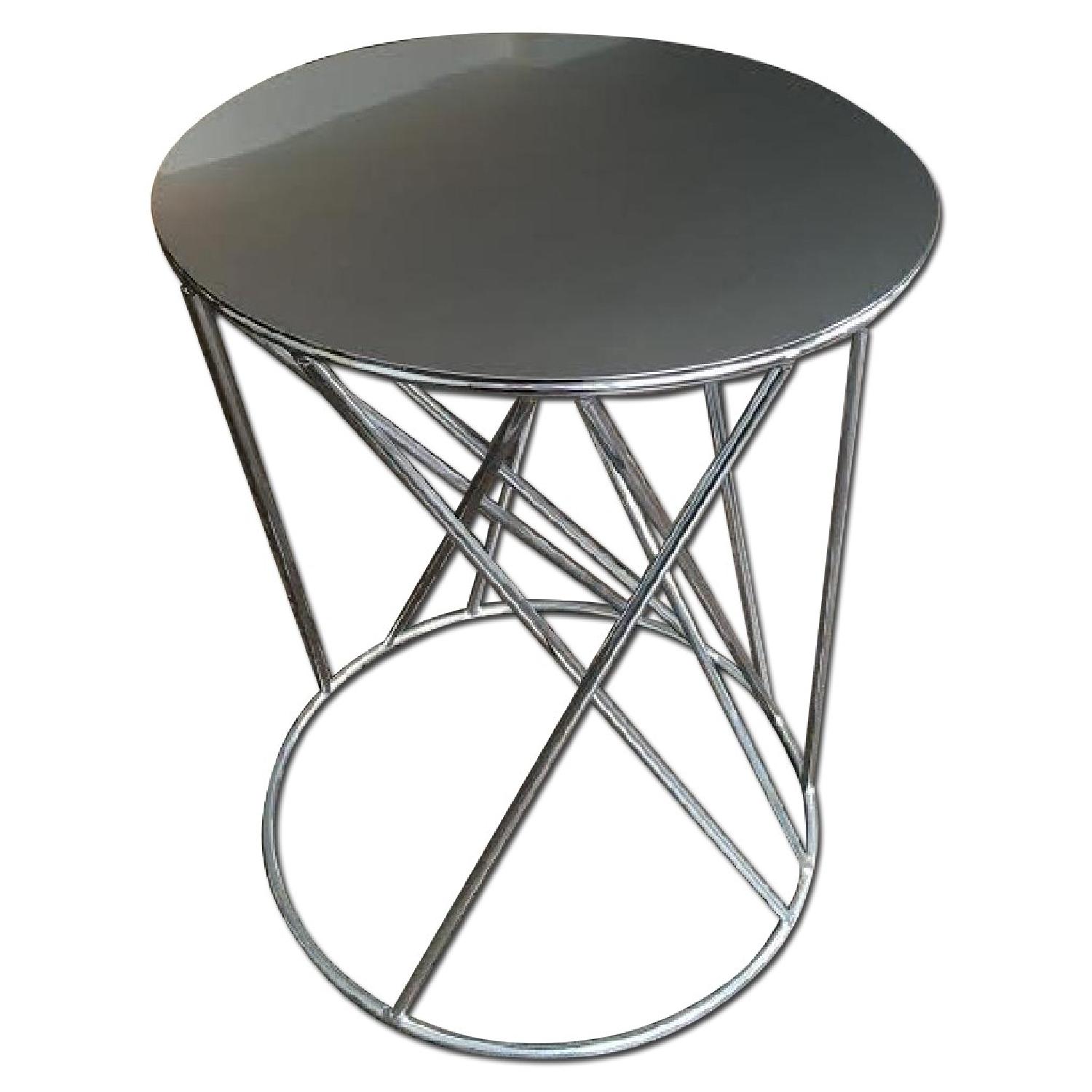 Seller's Notes:This is a simple mirrored round side table from Crate & Barrel with an interesting geometric base.