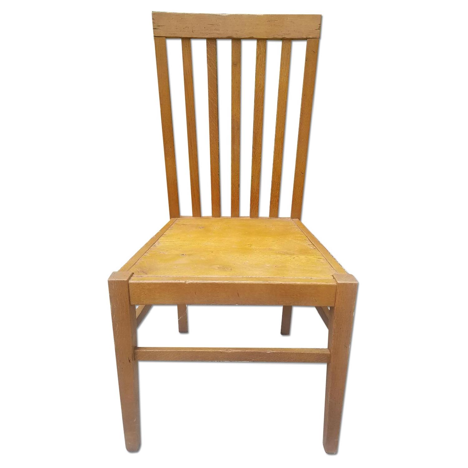 Seller's Notes:Set of six Crate & Barrel wooden dining chairs. Used these for a three years and then stored them for five, time to make some space! Great natural color with distress marks, mission style, comfortable. I paid around $150 per chair for these when I bought them new, but they've been discontinued at C&B since. FYI - seat is 18" from ground