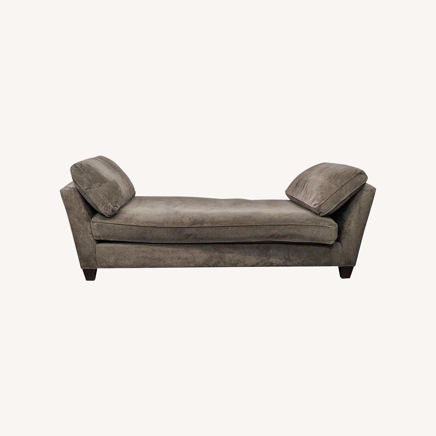 Seller's Notes:Description: Fabric Upholstered Slope Arm Daybed With Two Cushions And Dark Finish Wood Feet. Brand: Crate & Barrel. Seat heigt: 18. Gently used - any blemishes or damage will be included in the photos. #SKU: 1058710. Tags: liquidation,wood,modern,fabric