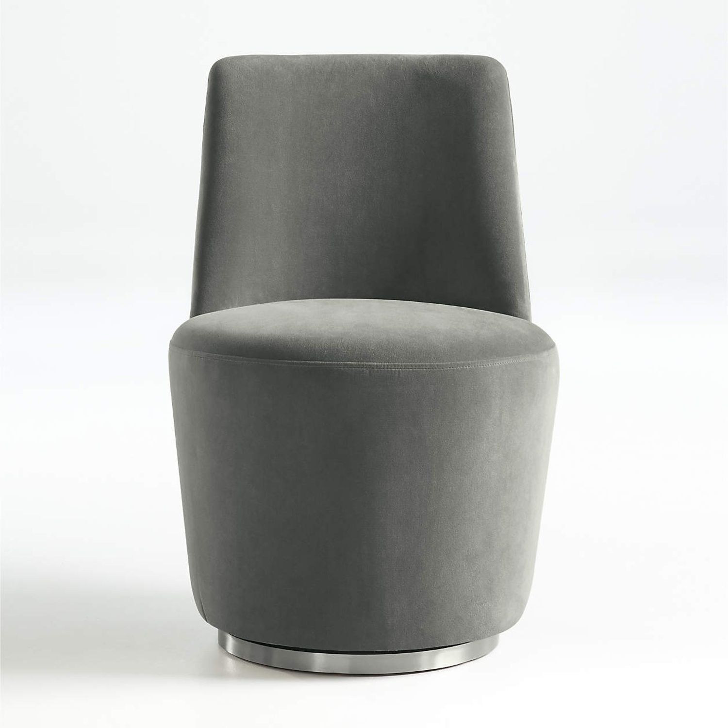 Designed for lively dinnertime conversation and post-meal lingering, our Ofelia dining chair indulges with comfy cushioning and plush velvet upholstery in chic slate grey. The chair's solid-body design is perfectly proportioned with a subtle taper to the back and seat to keep the look light and the feel luxurious. A recessed swivel base pivots easily for passing dishes and dinner-party banter. The perfect partner to any of our dining tables, the Ofelia slate grey swivel dining chair is a Crate and Barrel exclusive.