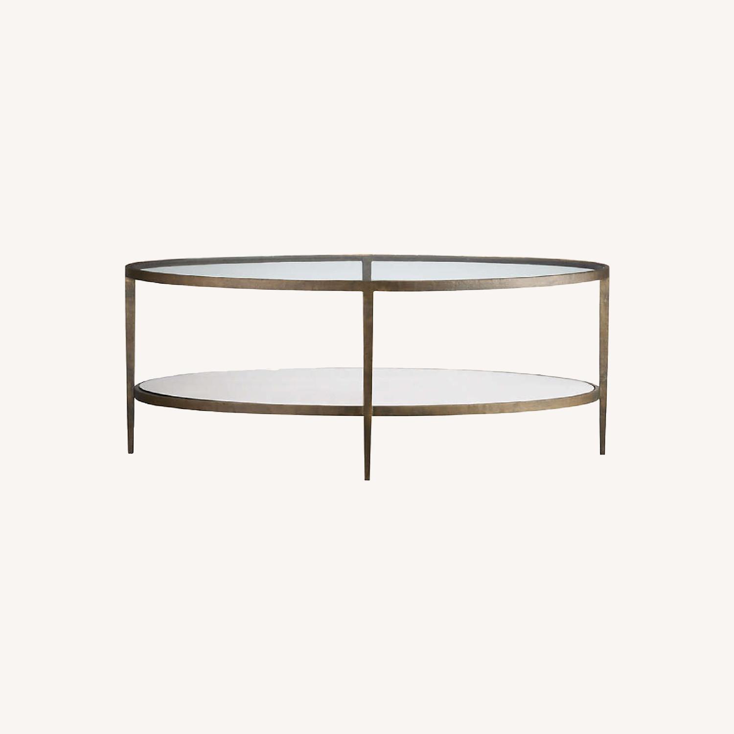 Seller's Notes:Crate and Barrel Oval Coffee Table 30"Wx48.03"Dx19"H Clean tapered lines reflect warmth with textured metallic tones framing clear and oval mirrored glass. A mirrored lower shelf reflects the coffee table's vintage-finished surface through a clear tabletop. The Clairemont Coffee Table is a Crate and Barrel exclusive. Forged metal Lacquer finish Tempered glass top Antiqued mirror shelf Made in India