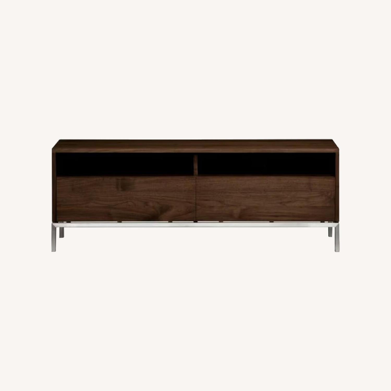 Seller's Notes:Warm, earthy real walnut wood with beautiful grain is elevated on a brushed stainless Pearson base, while keeping a low, sleek profile to accommodate a sizable TV (or whatever you choose to put on it! Plants, lamps, knick knacks…). One long fixed shelf with center divider stows electronic components. Two drawers store audio and video media, or whatever you want to store. It’s made by Crate & Barrel so you know the quality is amazing. The style is decidedly mid-century modern, but can stand out in any room or decor. There are a few minor scratches on the top but I think they can easily be repaired/covered. Overall the condition is excellent, sturdy, clean, ready to add to your room! SP