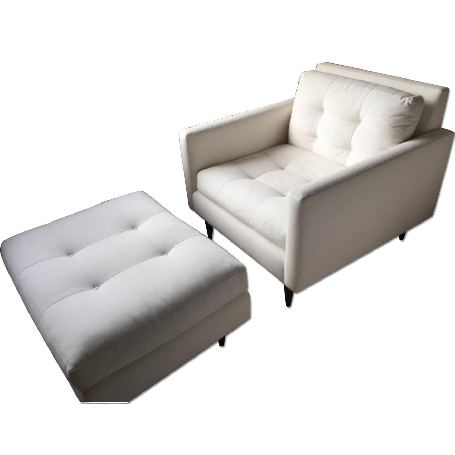 Seller's Notes:Barely used Crate & Barrel chair & ottoman in white brushed cotton fabric (no stains). Retro design with tufted, button cushions for a classic look that sits deep and firm but still let's you slouch in comfort. Delicate, tapered hardwood legs with espresso finish. Ottoman dimensions are 34"Wx24.5"Dx18"H. These pieces are still being sold at Crate & Barrel. ** Per co-op rules, delivery pick up can only be scheduled M-F 9a-5p.