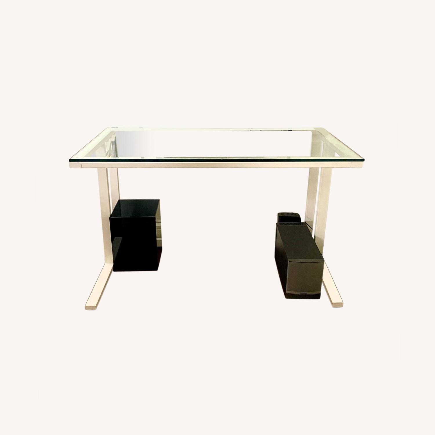 Seller's Notes:This light, airy desk features a clean, tempered glass top on a minimalist powder coated steel base in high-gloss white. Its open yet sturdy design provides for flexible seating (i.e. your legs won't hit the sides of the desk) without taking up much visual space or weight. The desk's glass top provides a ton of space for work, computers/laptops, space for writing, etc., and since it is glass, it's super easy to clean. I've loved this desk for years, but sadly, I'm moving to a new apt that cannot accommodate a desk of this size.
