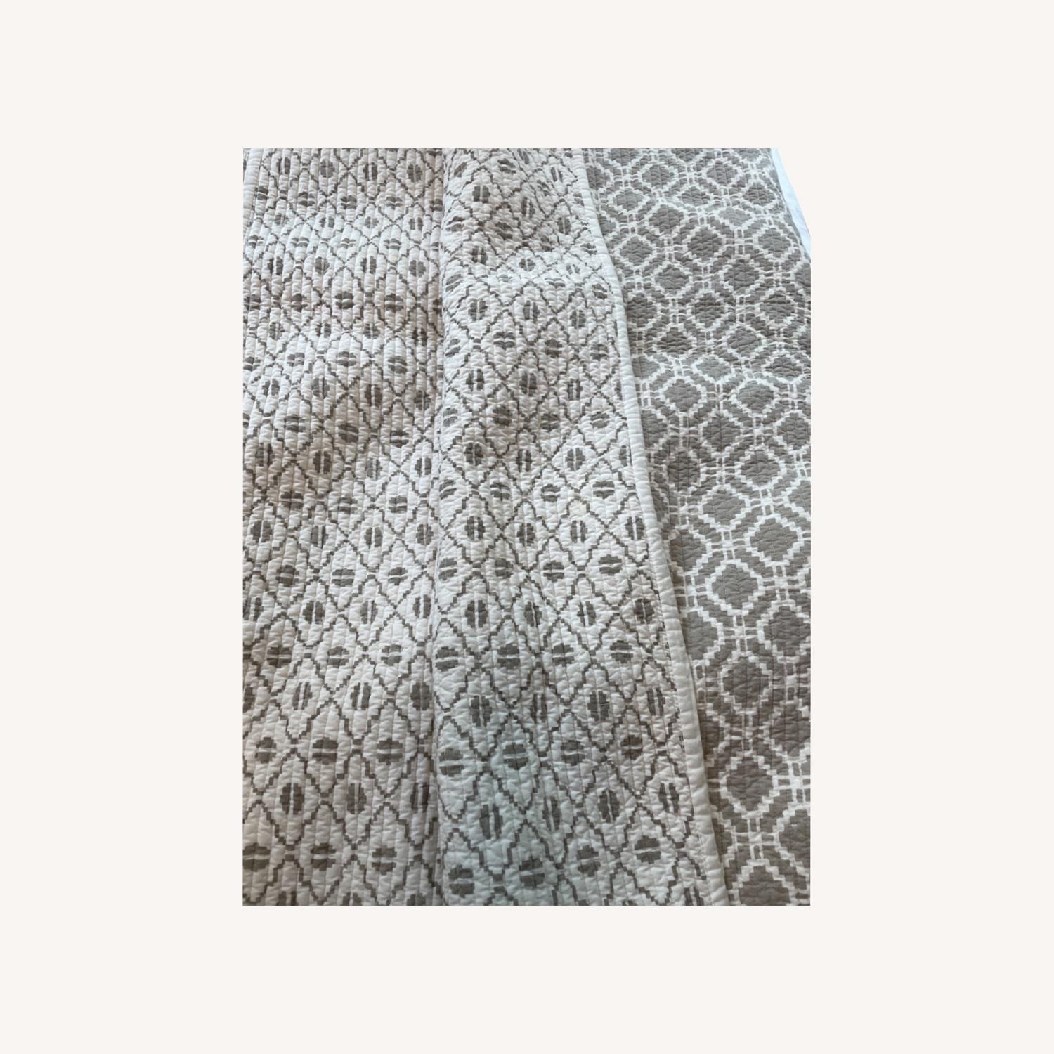 Seller's Notes:Beautiful reversible quote from Crate & Barrel. A few seasons old, but barely worn and still in great condition-only minor wear and tear on the borders. Super comfy and breathable. 100% Cotton. Reversible to suit your style - patterns flatter one another but offer variance. Colors are off white / brownish Gray. Neutral scheme.