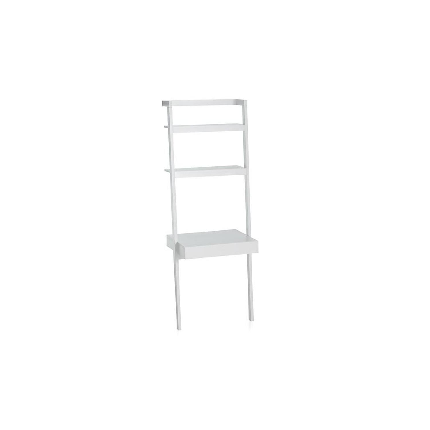 Seller's Notes:Crate & Barrel Sawyer white leaning desk with two shelves and one drawer. Can be screwed into wall for stability. Retailed for $179. Measurements: 27.75" W x 19.75" D x 76.25"H Condition: Structurally sound with imperfections like scratches and cracks in wood, as pictured. Drawer has come apart on sides but has been glued together so that it stays intact. Price is reflective of condition. Material: Solid mahogany, mahogany veneer over engineered wood and plywood. https://www.crateandbarrel.com/sawyer-white-leaning-desk/s206534 Available for pickup ASAP. Located in an elevator building in Downtown Brooklyn. Drawer is removable, but frame disassembly is not recommended.