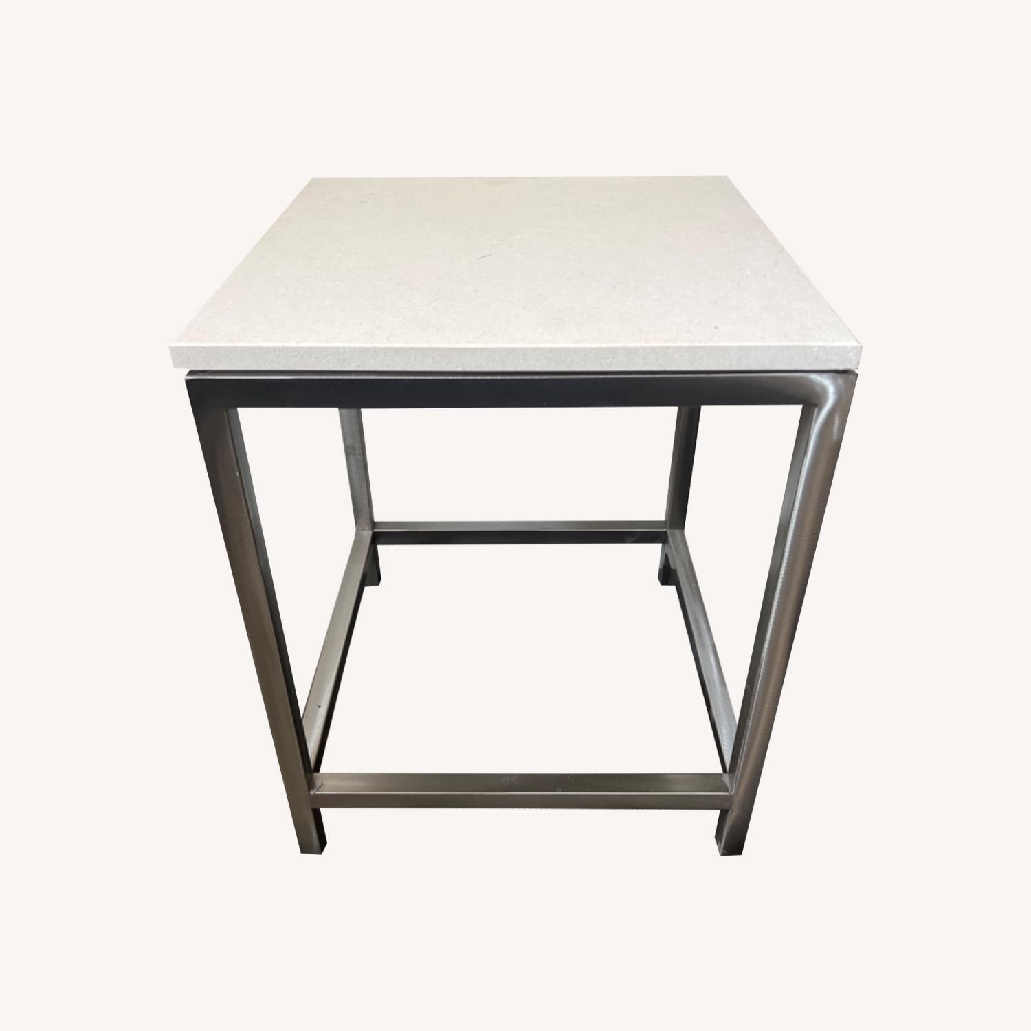 Seller's Notes:Two matching Crate and Barrel side tables. The tables are a metal frame with a white stone piece on top. The stone pieces are not fixed to the table, so they can be flipped over. Tables show minimal signs of use, but stone can be flipped to other side which shows no use, making these feel brand new.