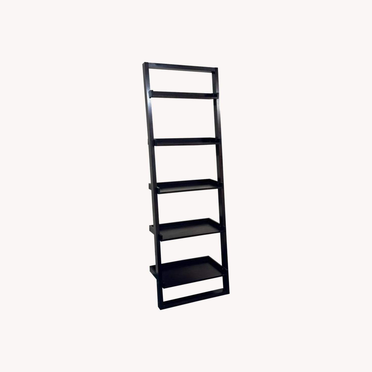 Design Plus Gallery presents a Sloane Espresso Finished Ladder Bookcase by Crate & Barrel. Five ledges graduate in depth as they lower in the unit. Each level has an exterior lip to contain belongings. Minor surface wear on frame; consistent with age and use.