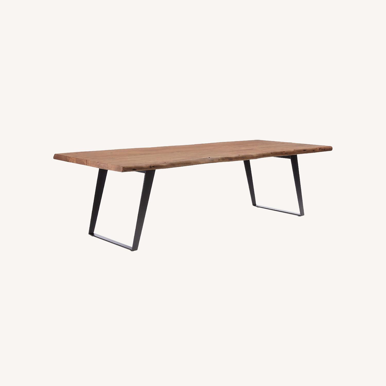 Seller's Notes:Table used for retail display. Very good overall condition, just a few tiny marks as pictured. Crate and Barrel description: Our beautiful Yukon table unites planks of solid acacia wood with exposed butterfly joints, bringing live-edge curves and warm wood tones to the casual dining room. Angled, U-shaped legs, fashioned from steel and finished in matte antique black, provide modern counterpoint. Seating up to 8, the large-scaled table makes a true statement, showcasing grains, knots, and fissures unique to each piece. The Yukon Natural 102"Dining Table is a Crate and Barrel exclusive. - Yukon Natural 102" Dining Table. 102.5"Wx42"Dx29.5"H - Raw-edge solid acacia wood with butterfly joints - Natural tint, acrylic sealer, topcoat and clear wax finish - Steel base with matte antique black finish - Butterfly joints - Each piece will vary due to unique wood characteristics - Depth of the table top may vary up to 2 inches - Seats up to 8 - Made in India