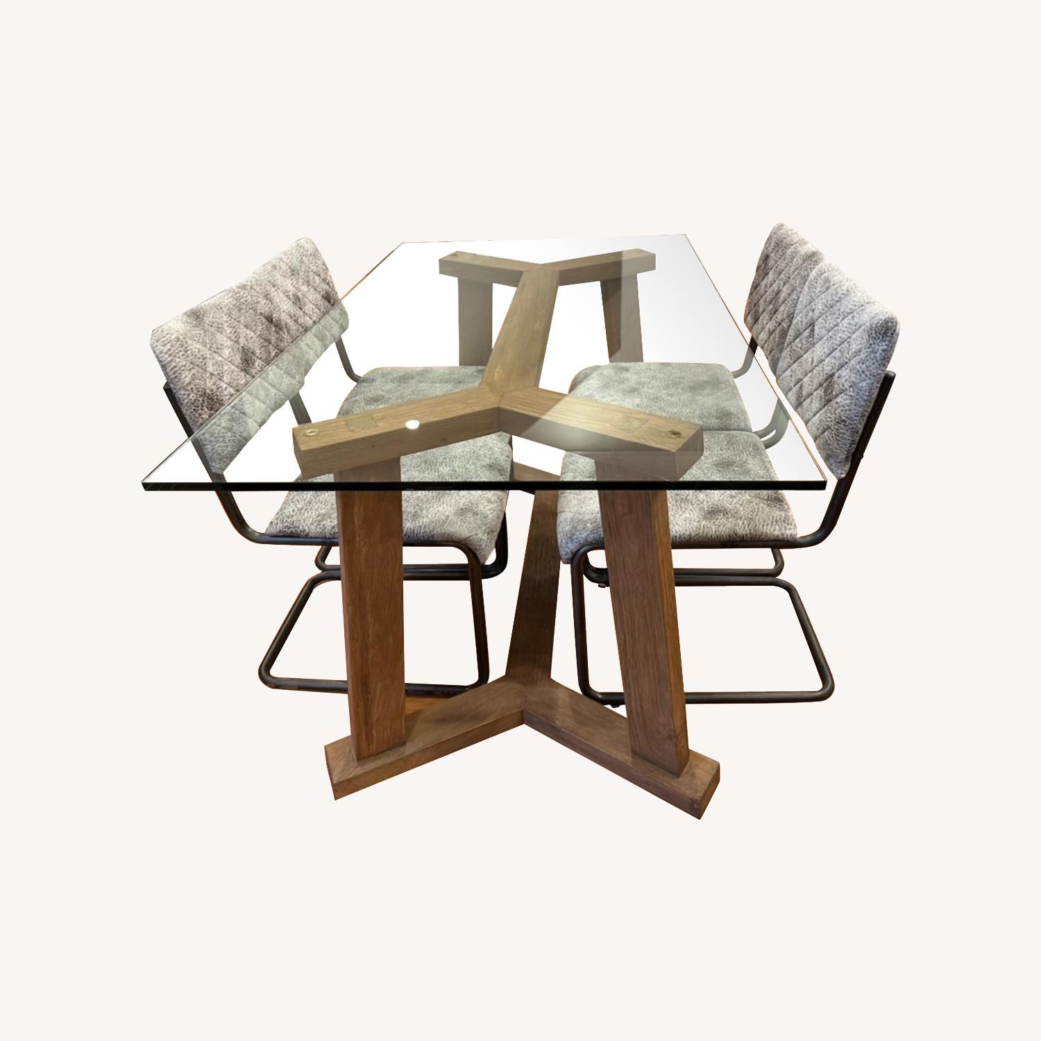 Seller's Notes:Crate and barrel kitchen dining table with chairs available. The bottom is solid teak wood and the top is a thick glass topper. The table and chairs are in excellent conditions with the glass topper having a few minor, barely noticeable scratches. Chairs are not crate and barrel brand but are modern with sturdy steel frames. Table can seat up to 6 with chairs placed on the ends but this set comes with 4 chairs. Kitchen table dimensions 60” long x 36” wide x 30” high Glass thickness - 1/2” thick Chair dimensions Chair seat 18” deep x 17” wide Chair height to seat - 18” Chair height to back of seat - 34“