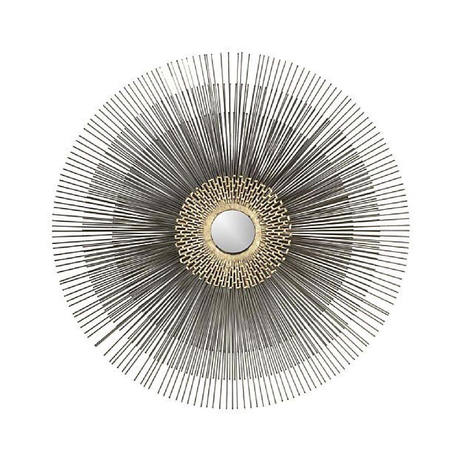 Seller's Notes:** Please note that all of my furniture is AptDeco verified, meaning that AptDeco physically visited my home and confirmed the condition of the listed furniture ** This starburst mirror is inspired by a mid-century antique. A mini mirror is surrounded by an antiqued brass geometric starburst radiating three layers of steel spring wires. Brass drippings create a bright textural circle at the center Steel spring wire with brass drippings Clear powdercoat finish 4" dia. mirror Keyhole hanger Bathroom safe 15 lbs. Note that one of the spokes is slightly back from the others (it is very slight - just wanted to be fully transparent). For more info, see http://www.crateandbarrel.com/starburst-round-wall-mirror/s538345?b=1&a=1552&campaignid=206278616&adgroupid=13795205936&targetid=pla-56128534817&adpos=1o1&creative=44761147496&device=c&matchtype=&network=g&gclid=CIH26Irvi8oCFZaPHwody5wNjw Selling because I purchased a new condo and am decorating from scratch