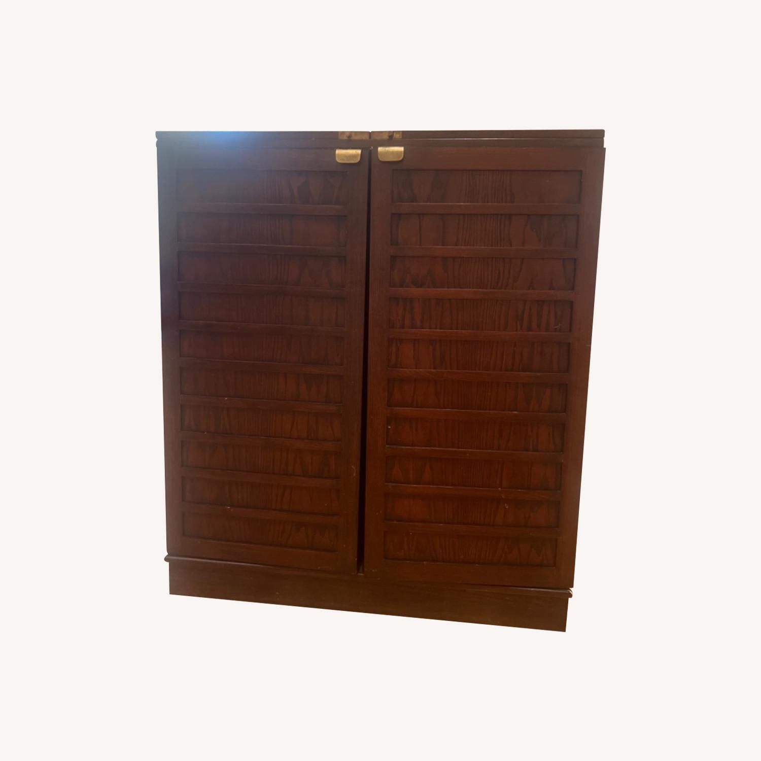 Seller's Notes:A beautiful piece with incredible storage for glassware, bottles, and proper wine storage. The top opens to become a large buffet. Cabinet is on wheels and is in perfect condition, except for the one blemish on the top. Details are in copper color.