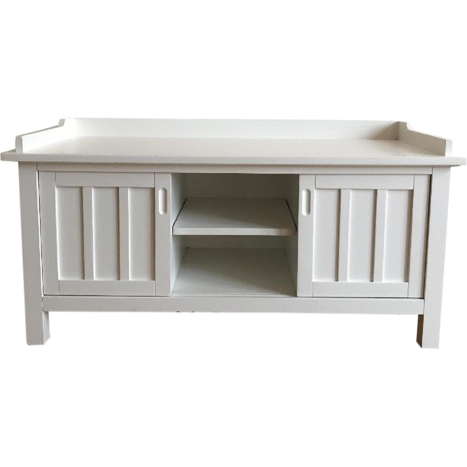 Seller's Notes:Crate and Barrel storage bench with sliding doors. Well-constructed out of solid wood, this bench has many years of life left and is in good condition. A few *photographed* dings here and there, but otherwise clean and ready for use. Clean white finish is in good condition, and the top will hold a cushion if necessary. Holds plenty of shoes underneath, and the doors are removable for cleaning.