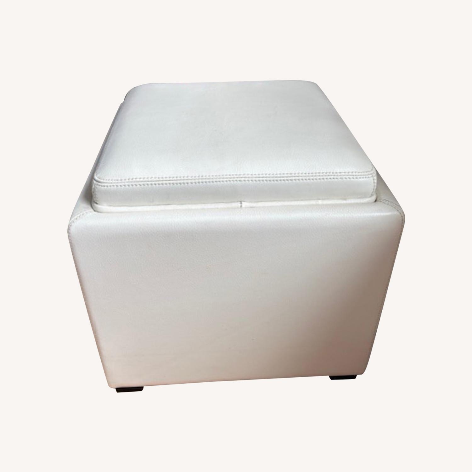 Seller's Notes:Leather storage ottoman-can double as a table with dark timber table top under the lid of the ottoman, storage shown black fabric interior-unstained.