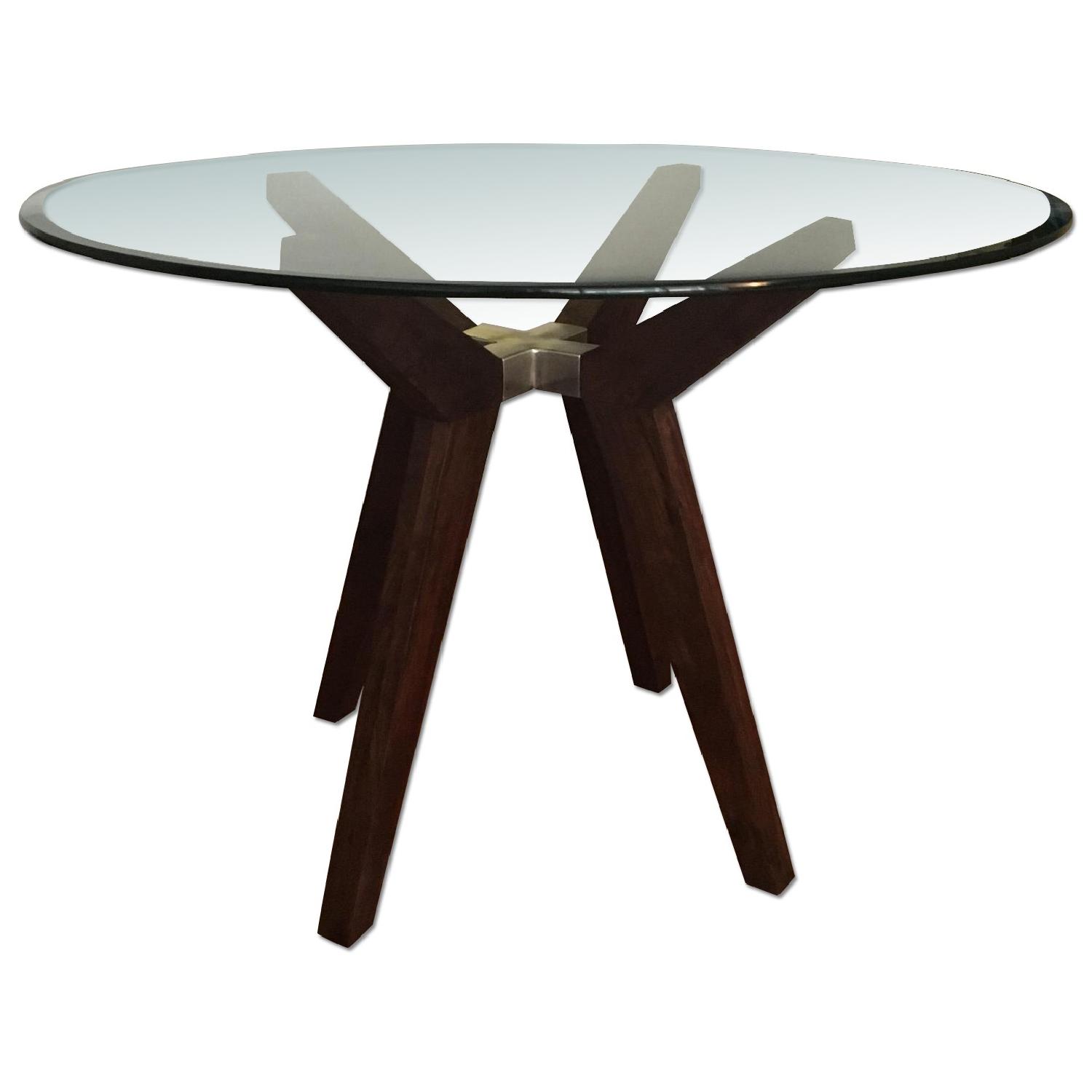 Seller's Notes:Crate & Barrel 42" round glass dining table Base: Shesham wood and stainless steel, walnut stain Top: 42" dia. glass top Seats four comfortably Great condition - there are several small scratches on the glass top, but it's not very noticeable Purchased 4 years ago We are moving and it unfortunately doesn't work in our new space