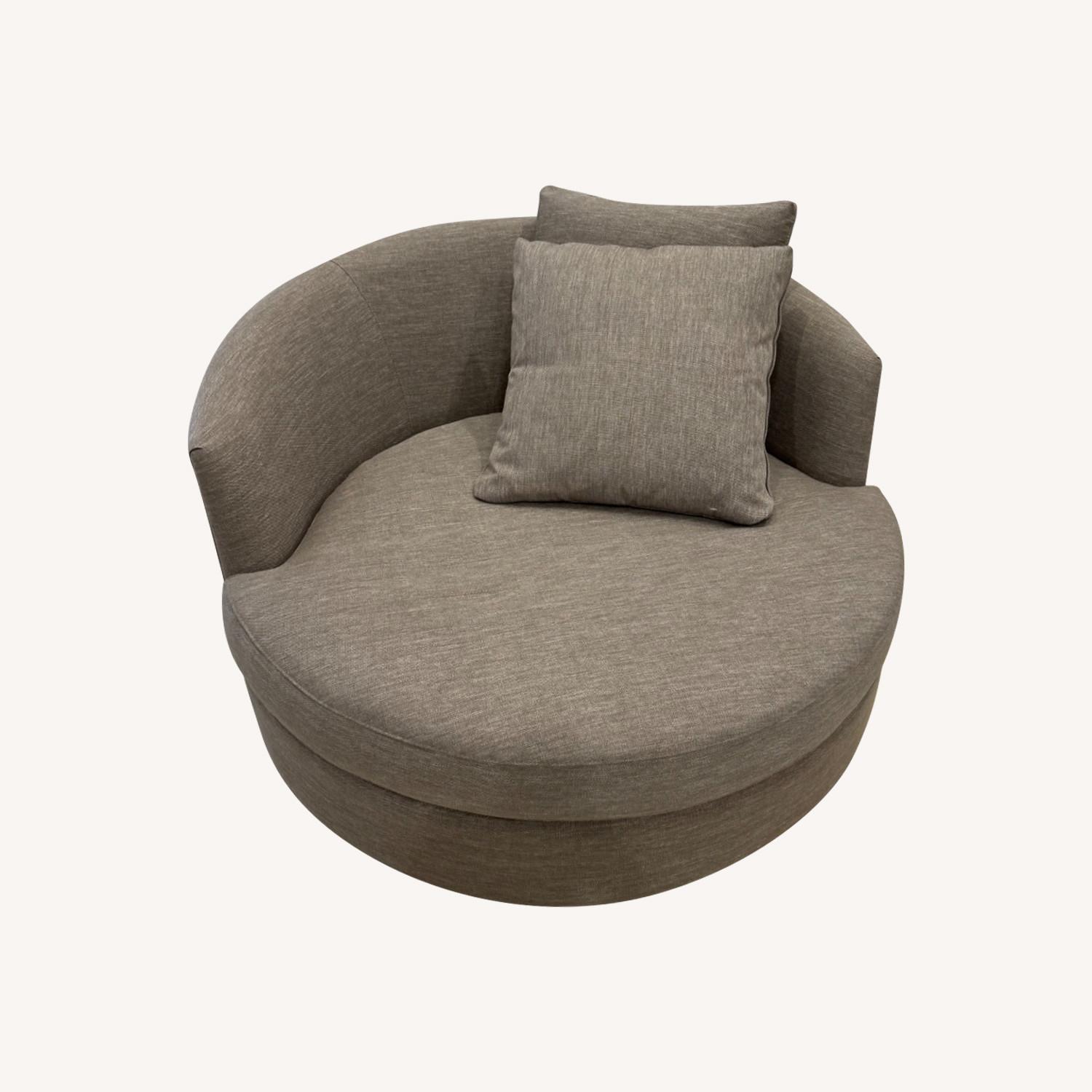 Seller's Notes:Tillie Grande Swivel Chair 51"Wx51"Dx31"H Frame is benchmade with solid and laminated hardwood that's kiln-dried to prevent warping Synthetic webbing suspension system Soy-based polyfoam seat cushion wrapped in fiber-down blend and encased in downproof ticking Soy-based polyfoam back cushion wrapped in synthetic fiber encased in downproof ticking Includes 2 throw pillows Self-welt and topstitch detail 360-degree swivel mechanism